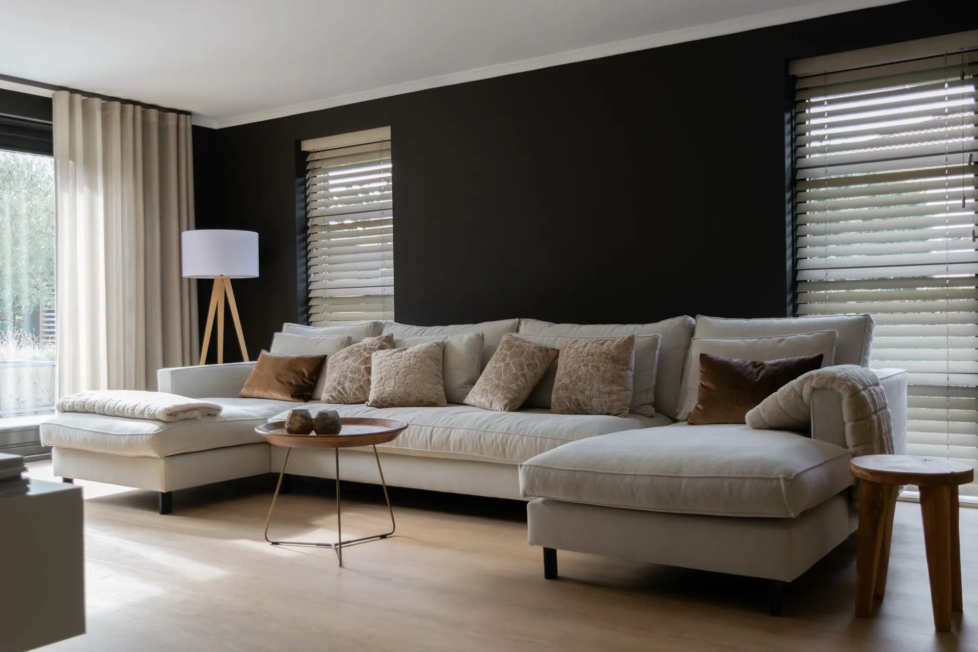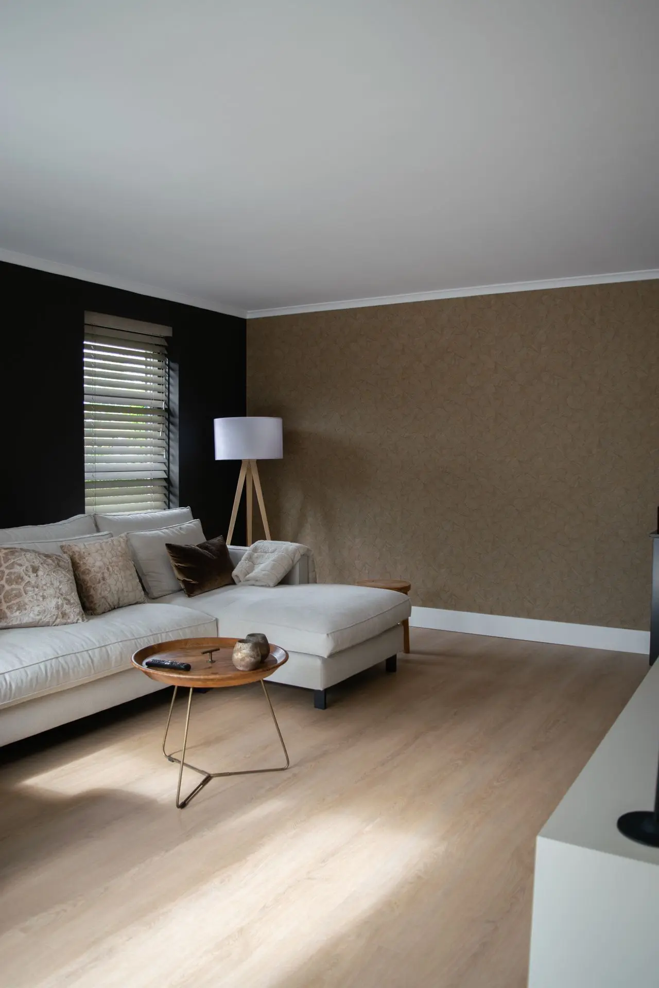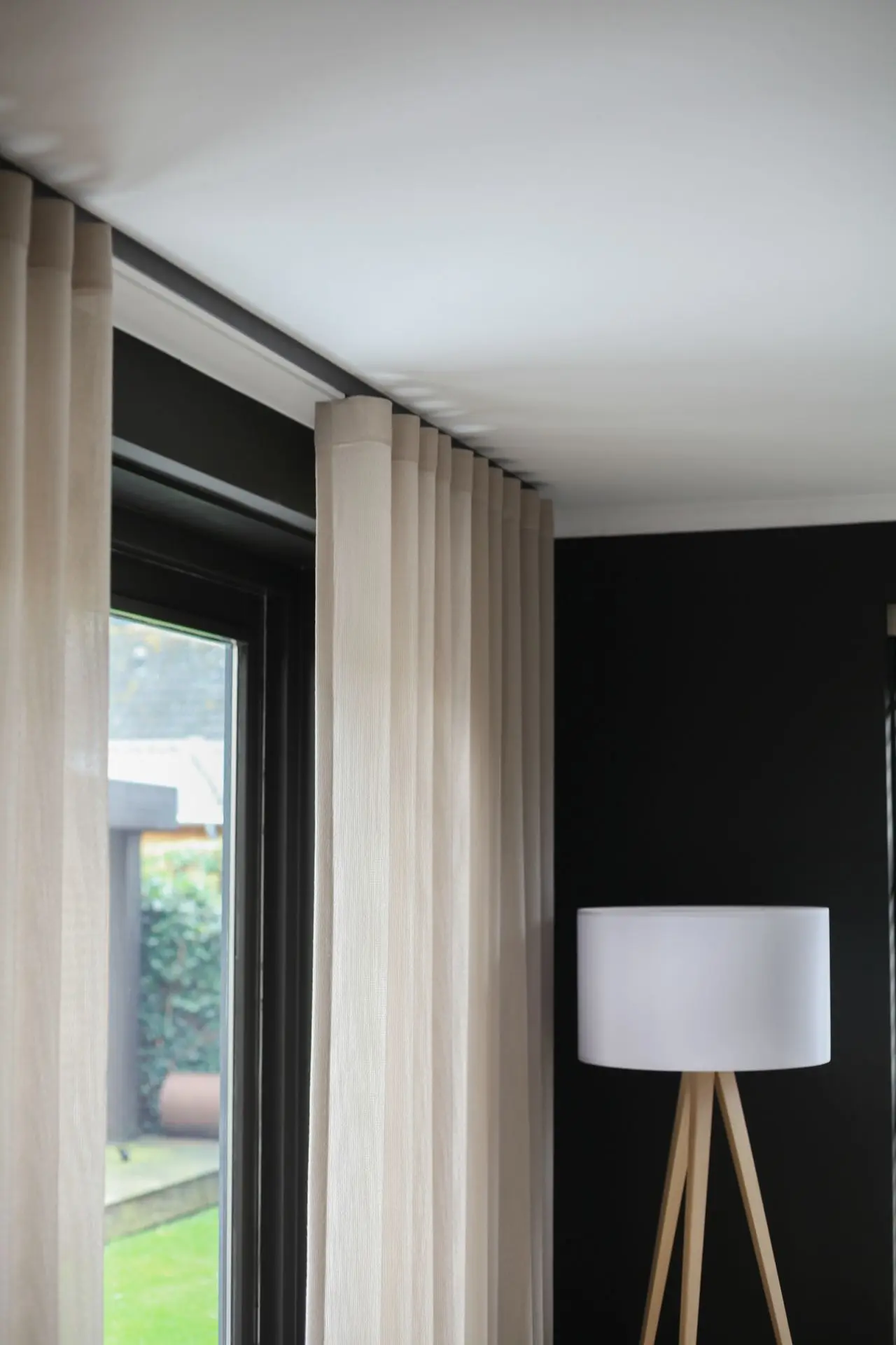Het contrast is gecreëerd door het lakwerk in de Home Made By Turf kleur en deze kleur zit ook op de wand achter de bank. Hierdoor krijgt de zithoek een fijn en huiselijke sfeer. De gordijnen in een waveplooi geven net dat sierlijke accent aan de (rechthoekige) ruimtes en de stof zorgt voor een luxe uitstraling. De houten raamdecoratie geeft een warm geheel samen met de kleur van de wanden.