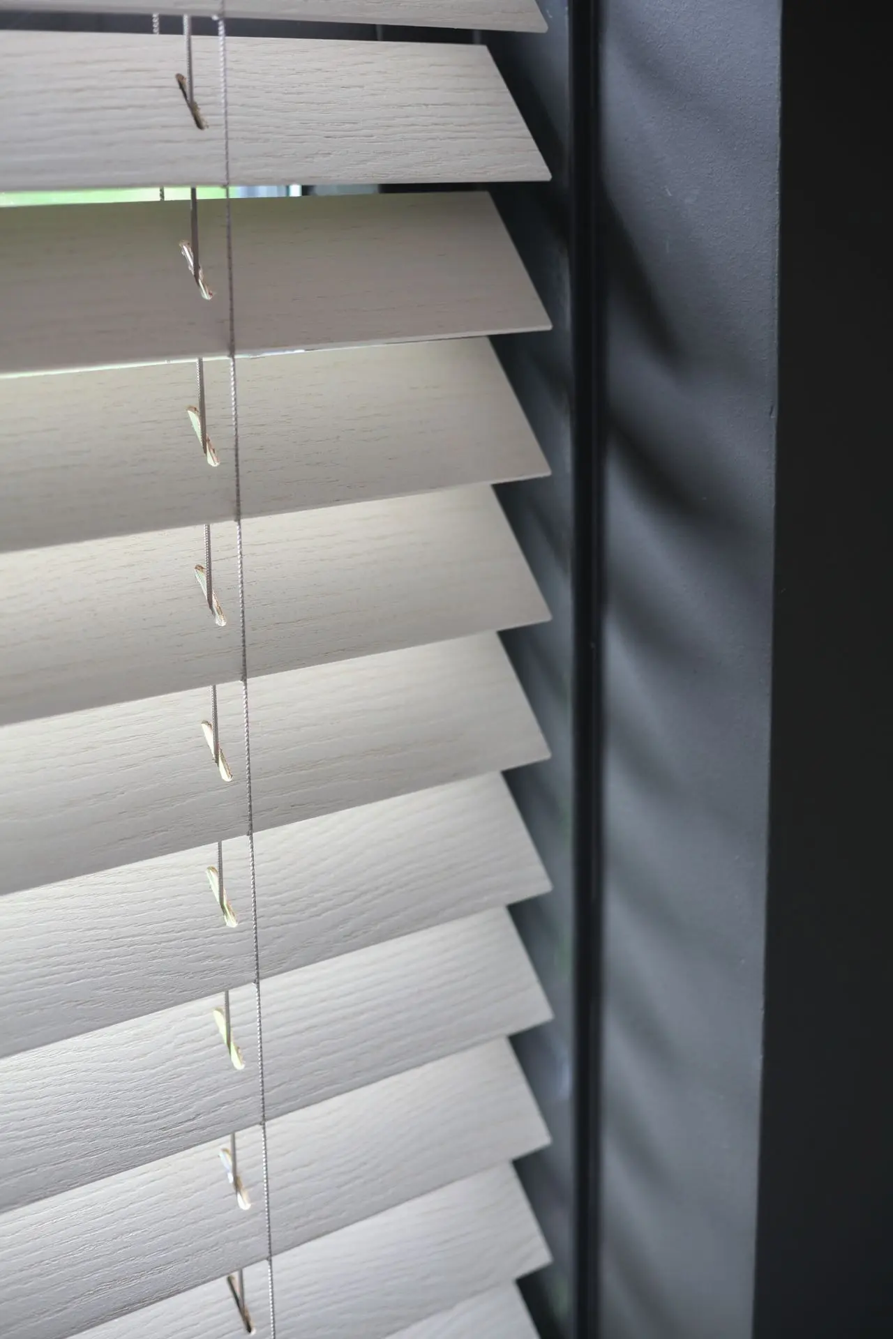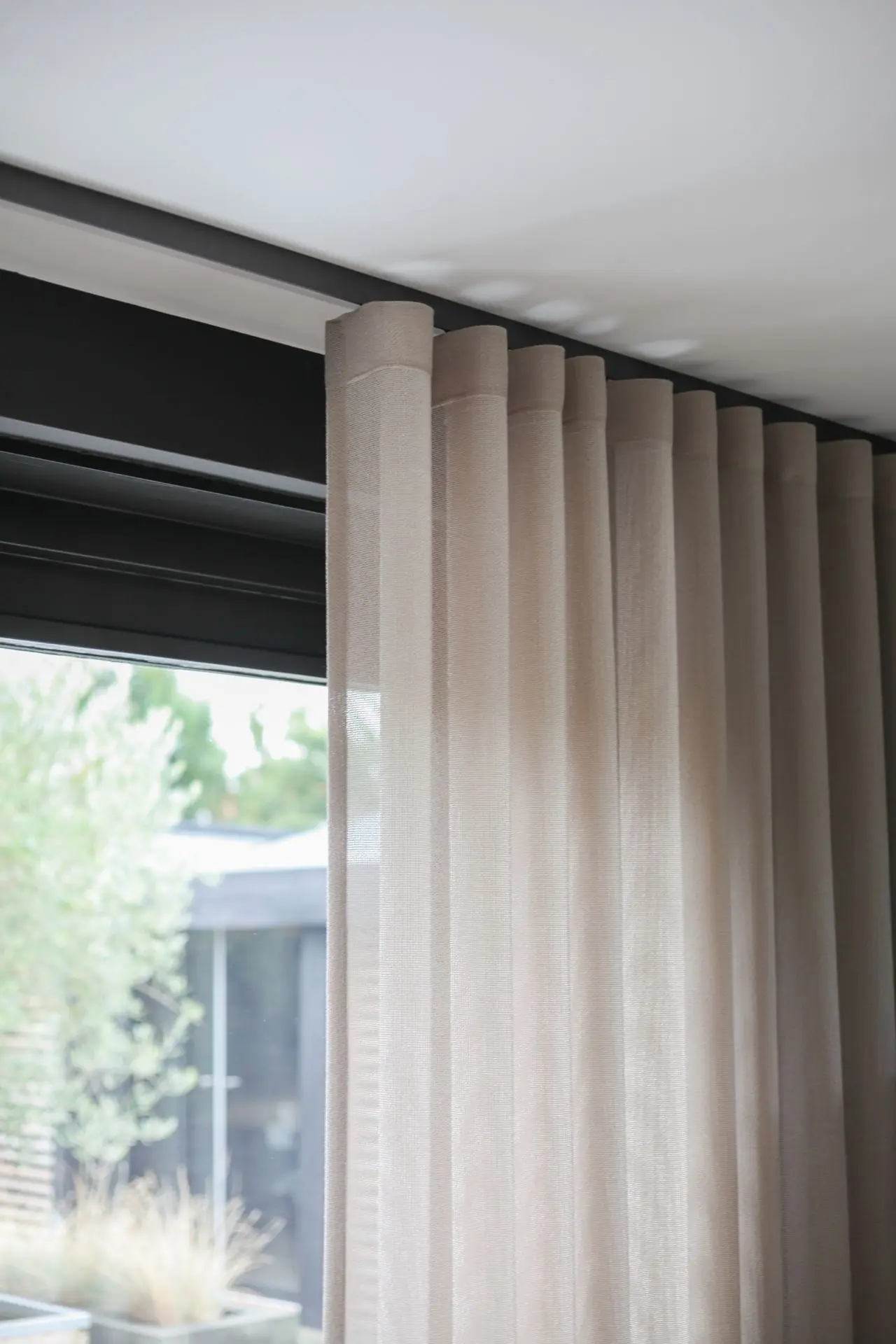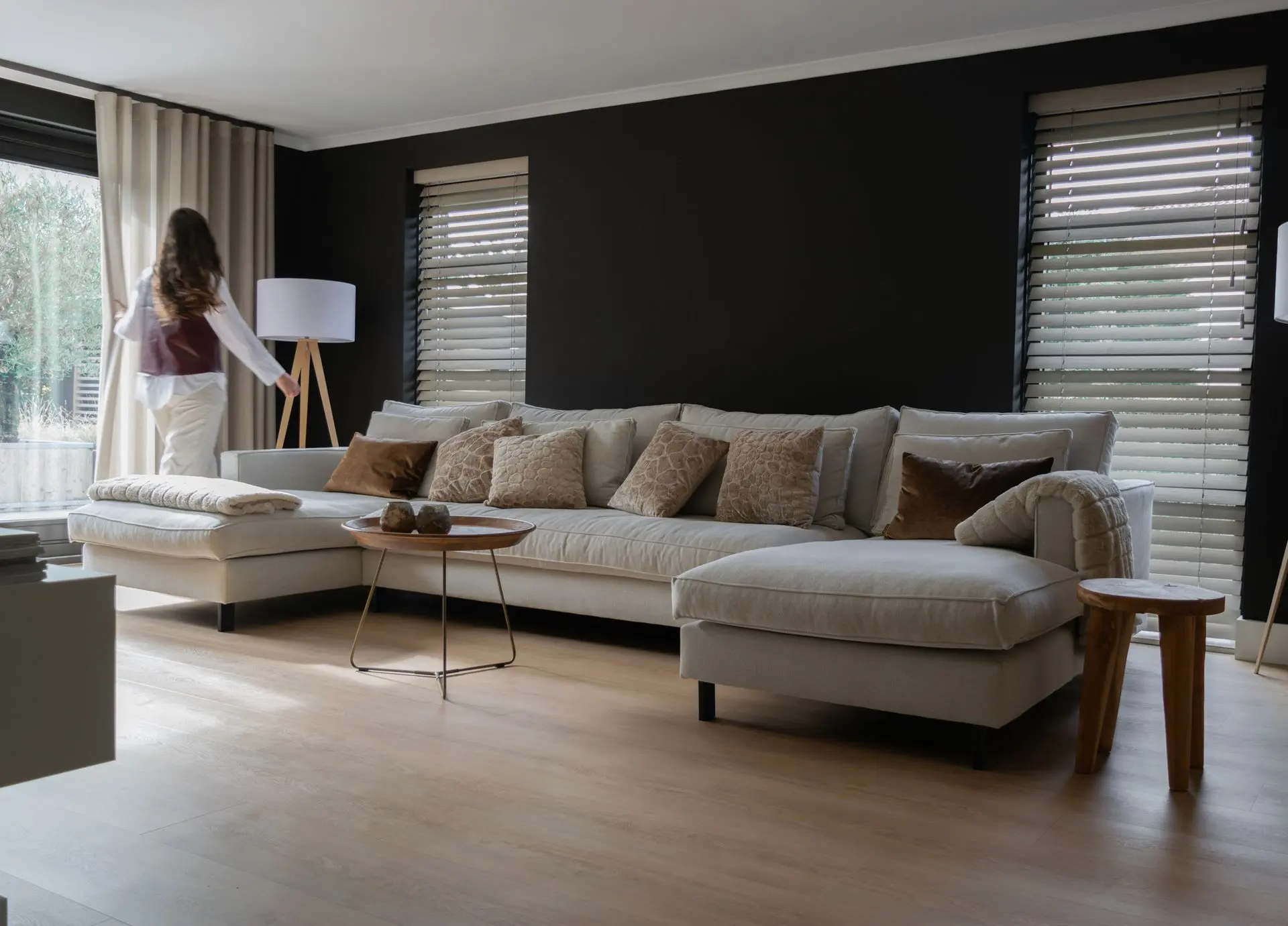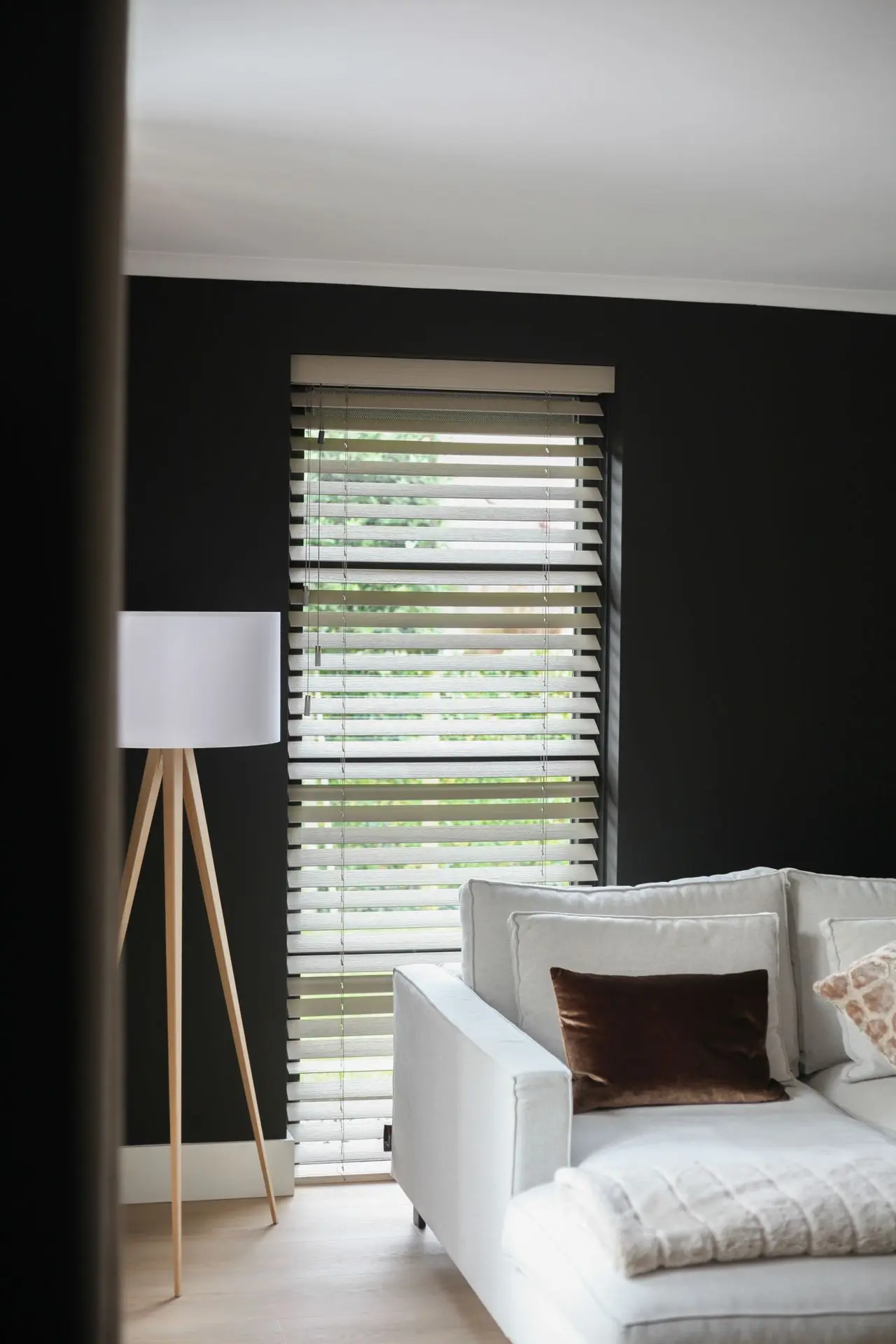 Het contrast is gecreëerd door het lakwerk in de Home Made By Turf kleur en deze kleur zit ook op de wand achter de bank. Hierdoor krijgt de zithoek een fijn en huiselijke sfeer. De gordijnen in een waveplooi geven net dat sierlijke accent aan de (rechthoekige) ruimtes en de stof zorgt voor een luxe uitstraling. De houten raamdecoratie geeft een warm geheel samen met de kleur van de wanden.