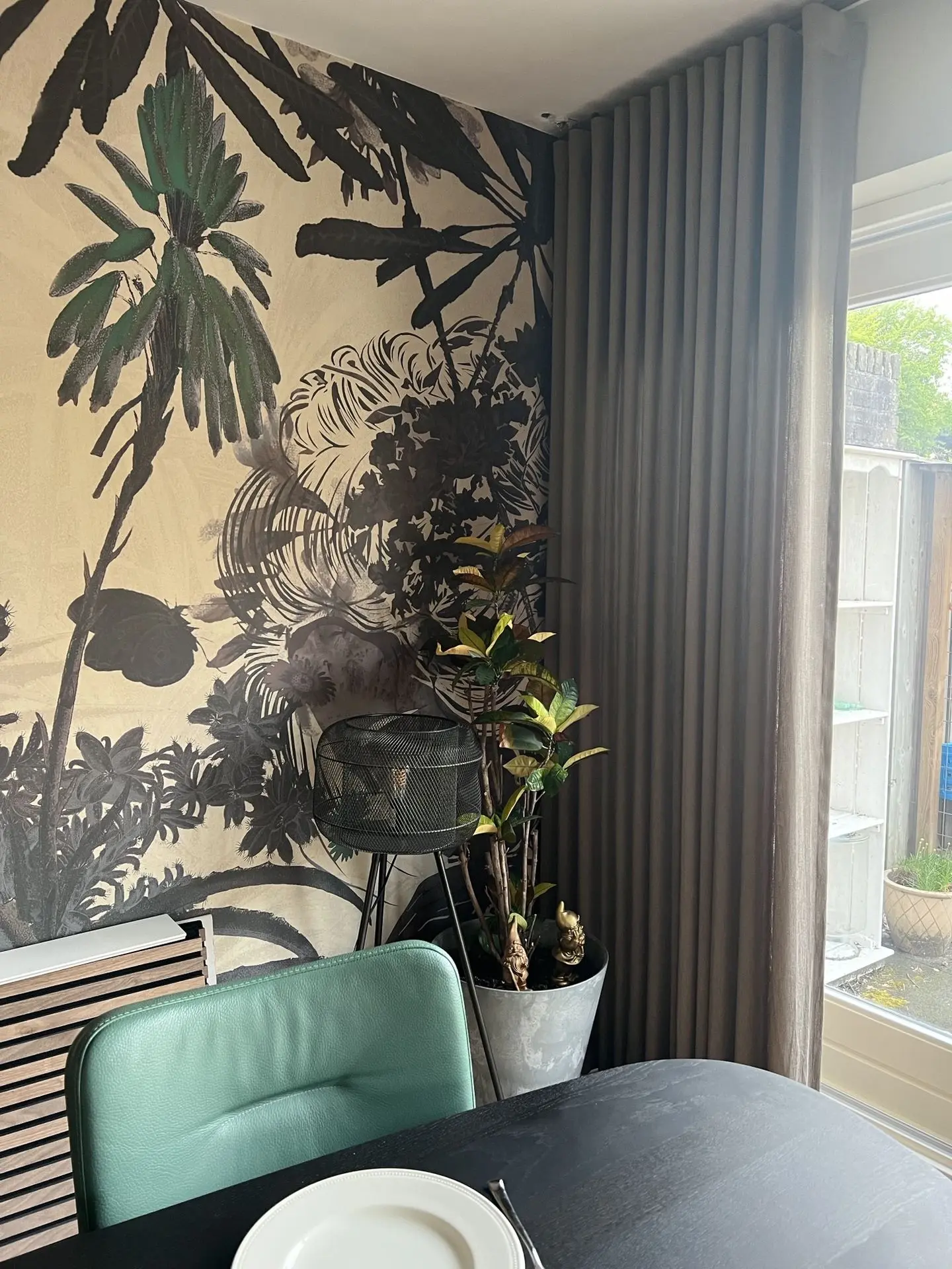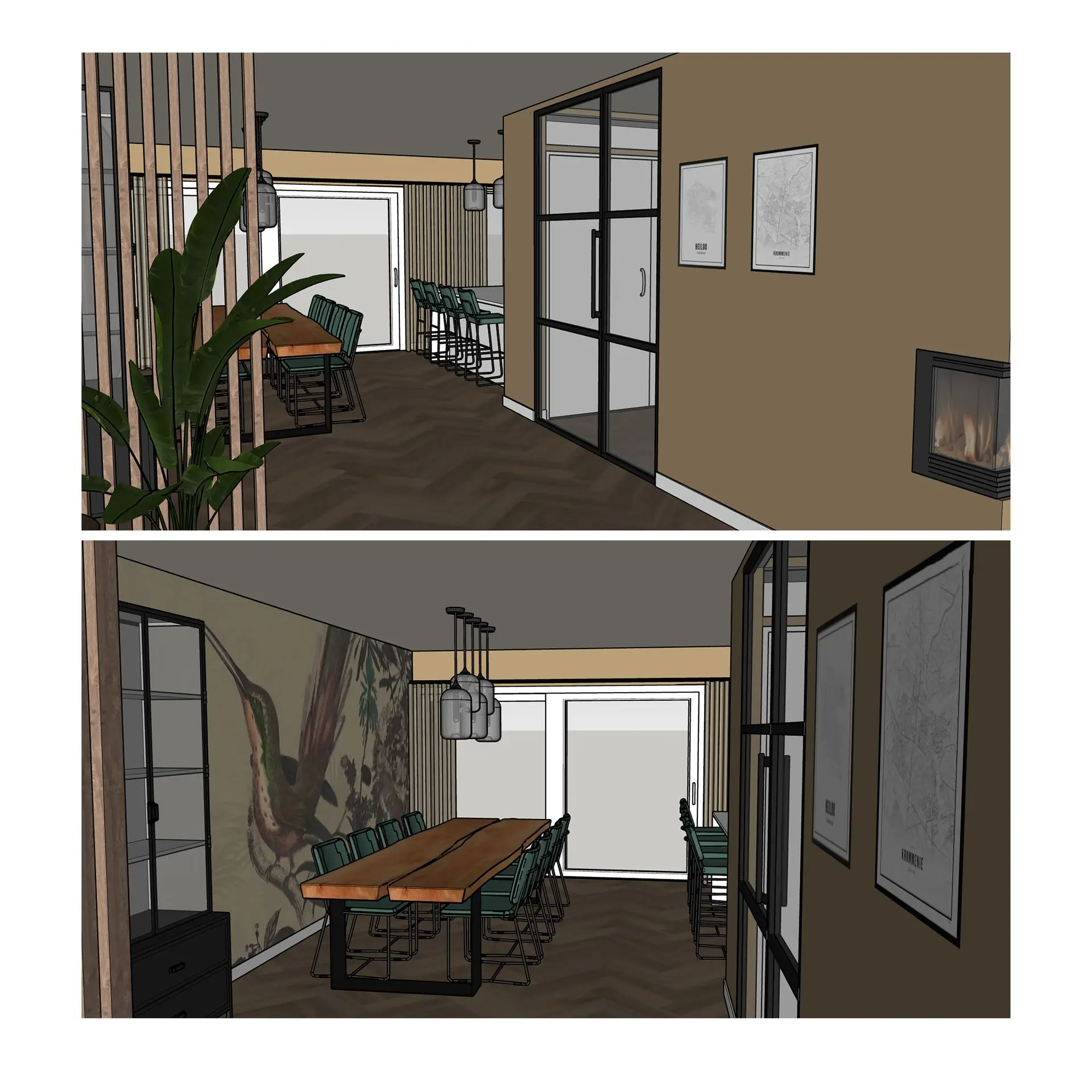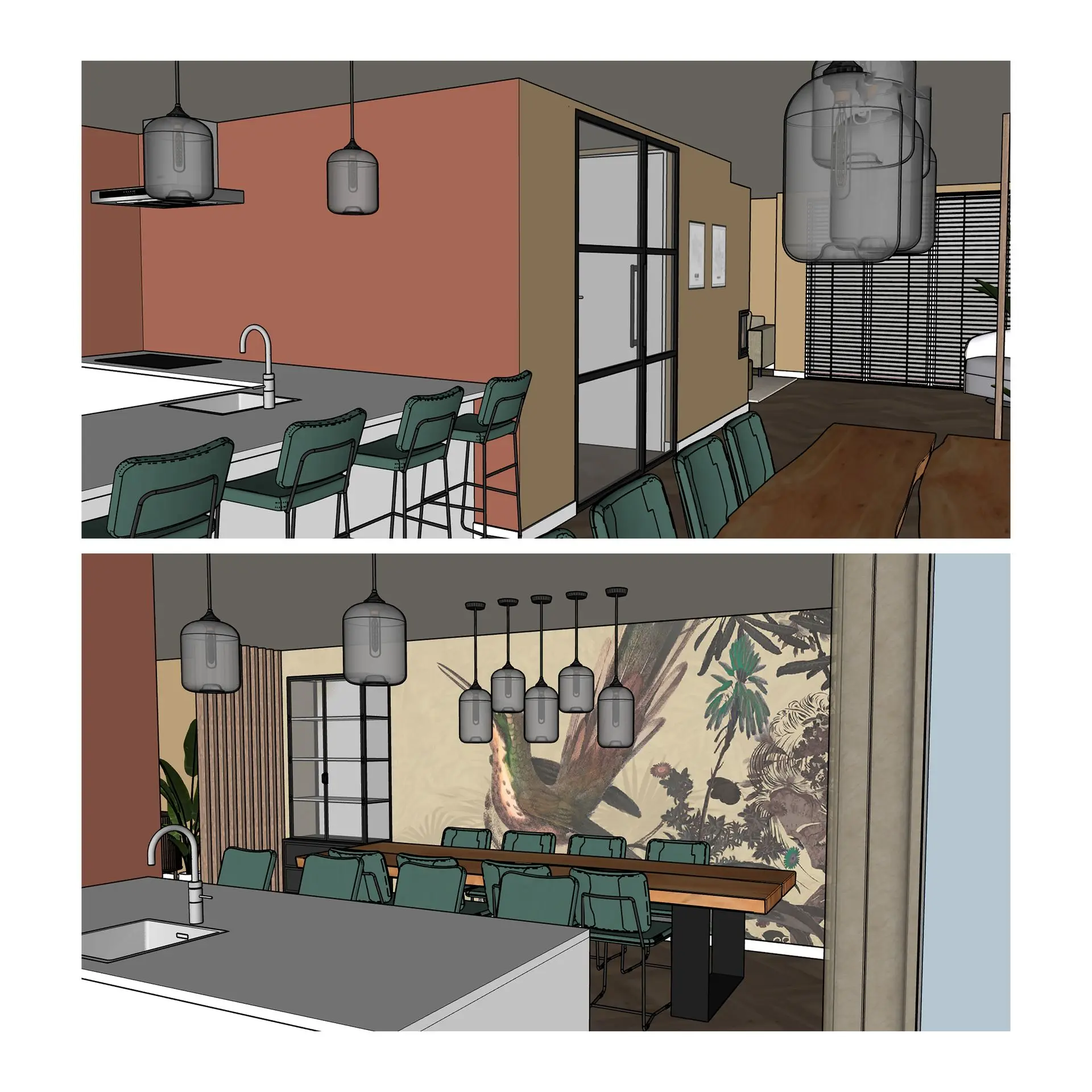 Het behang komt in de eethoek op de lange wand. Deze lange wand heb ik opgesplitst door een roomdivider toe te passen van Walnoot hout. Op deze manier worden er twee ruimtes gecreëerd. De keuken is van hoogglans wit met een lichtgrijze aanrechtblad. Hier kon wat kleur aan toegevoegd worden. De kleur Panama past onwijs goed bij het behang, dus deze heb ik op de wanden in de keuken toegepast. Er komt een eikenhouten eettafel met bestaande, groene, leren stoelen te staan voor 8 personen. Aan de bar komen dezelfde type stoelen te staan als om de eettafel alleen hoger.