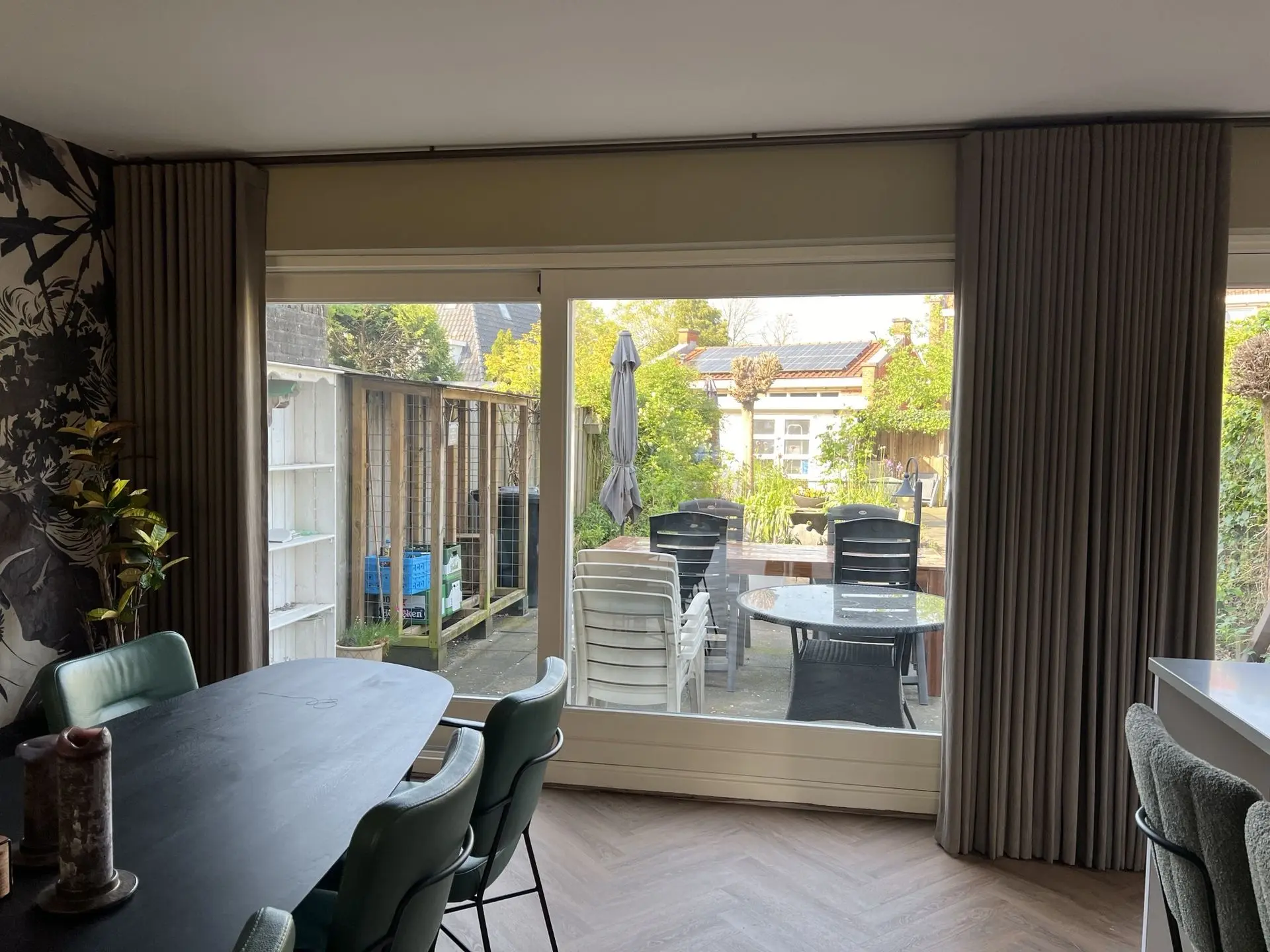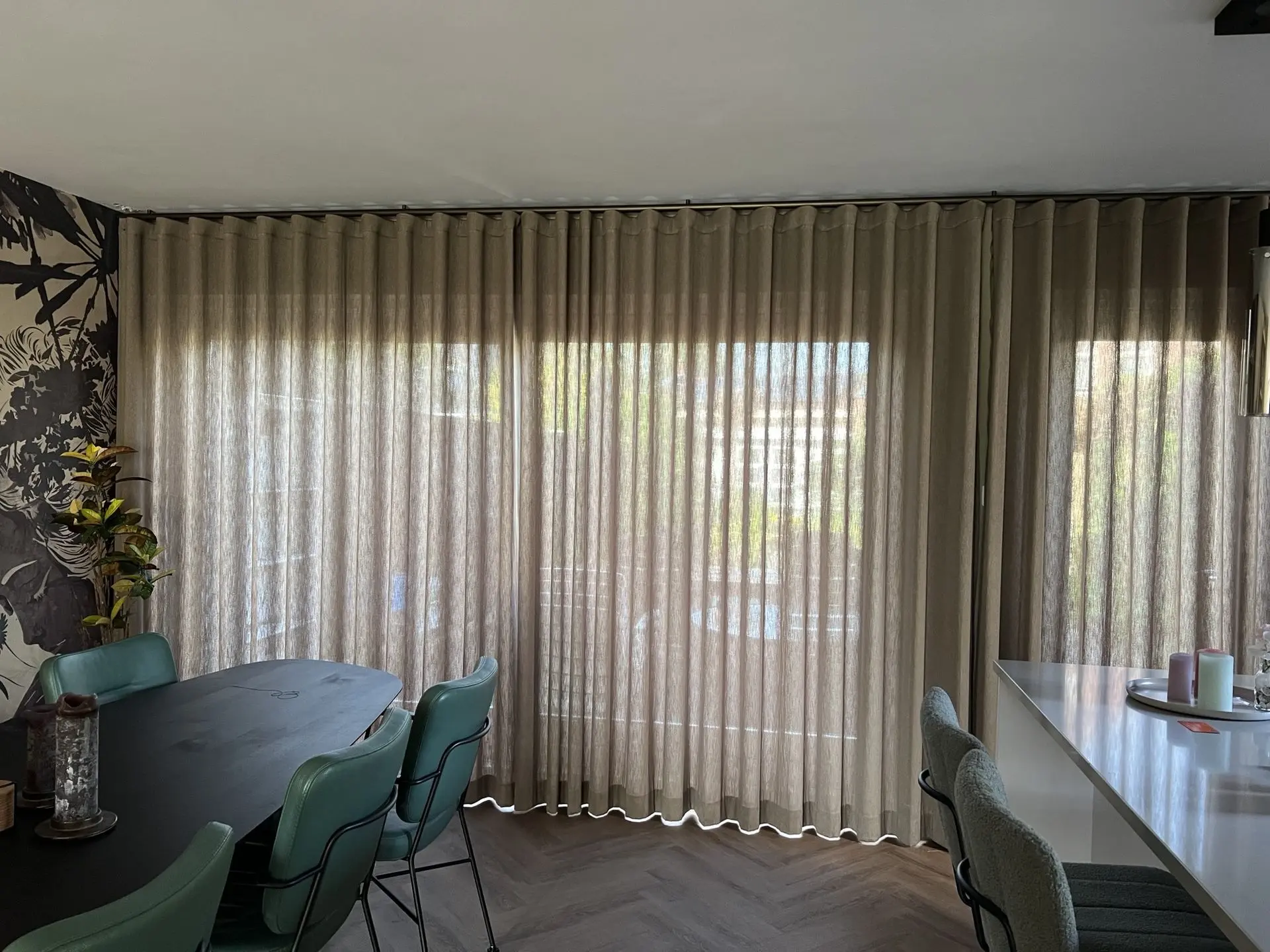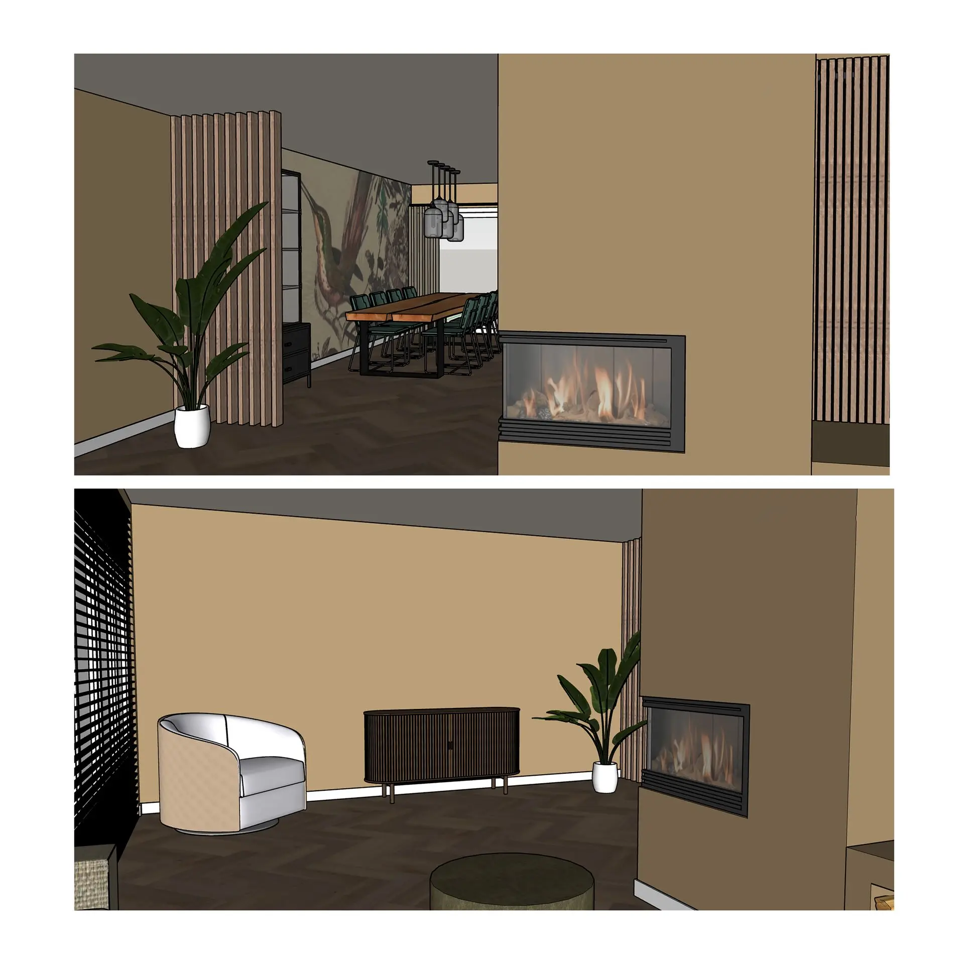 Het behang komt in de eethoek op de lange wand. Deze lange wand heb ik opgesplitst door een roomdivider toe te passen van Walnoot hout. Op deze manier worden er twee ruimtes gecreëerd. De keuken is van hoogglans wit met een lichtgrijze aanrechtblad. Hier kon wat kleur aan toegevoegd worden. De kleur Panama past onwijs goed bij het behang, dus deze heb ik op de wanden in de keuken toegepast. Er komt een eikenhouten eettafel met bestaande, groene, leren stoelen te staan voor 8 personen. Aan de bar komen dezelfde type stoelen te staan als om de eettafel alleen hoger.