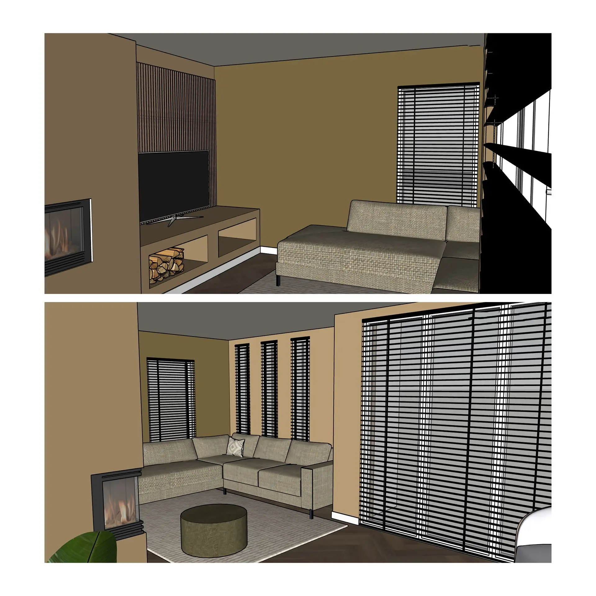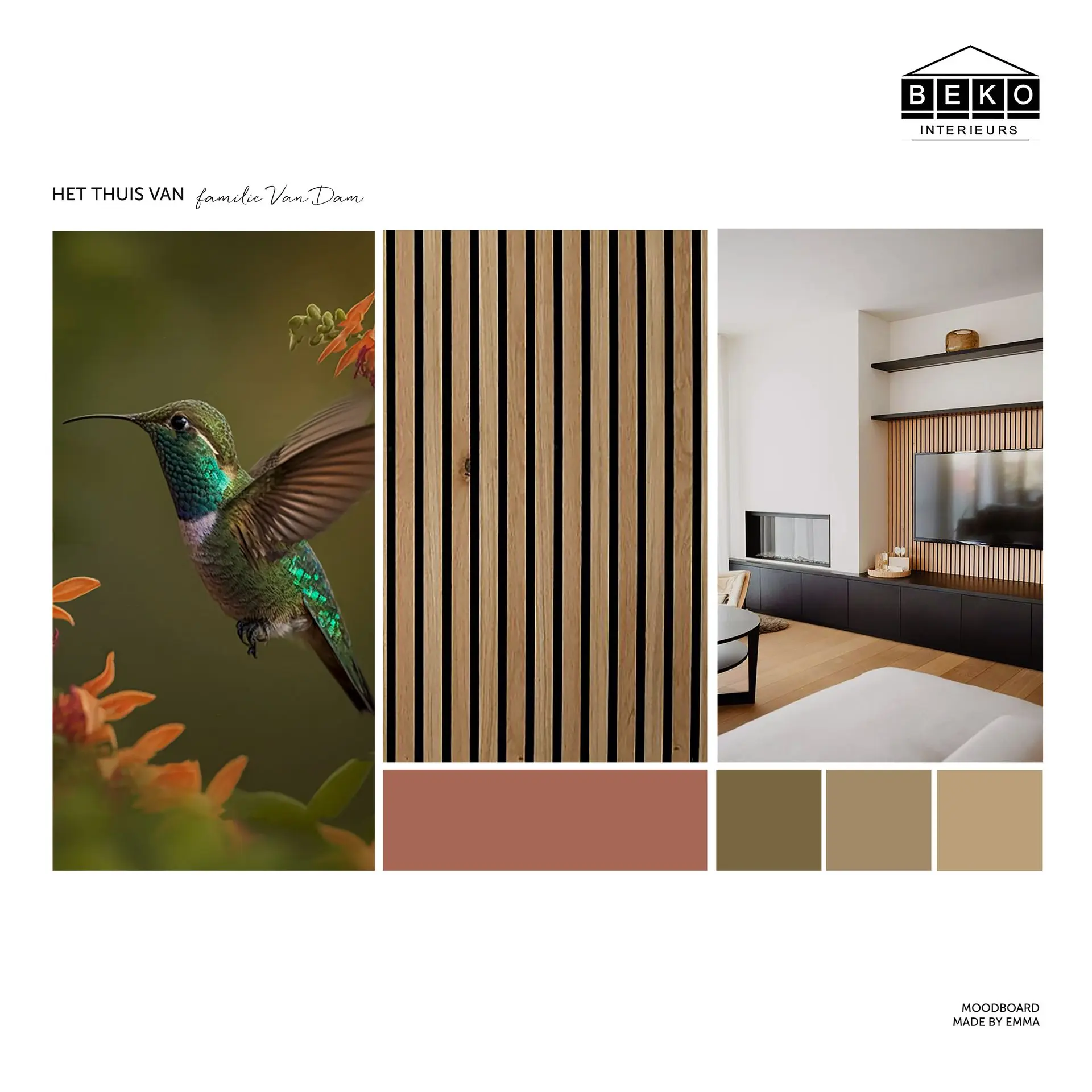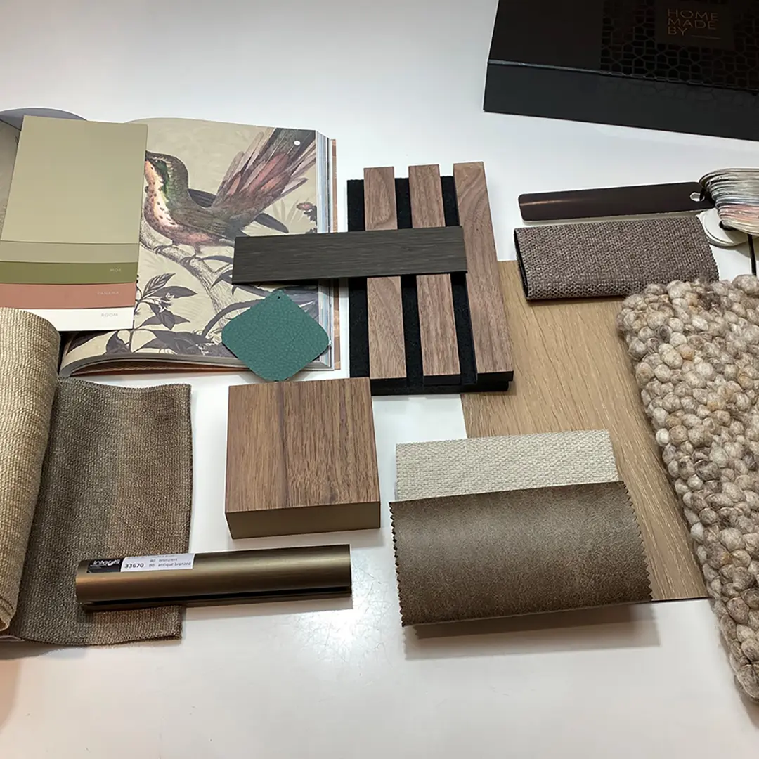 Uit de Design Date kwam naar voren dat als basis warme en natuurlijke kleuren de klant het meest aanspreken. Hiervoor heb ik de kleuren Canvas en Safari uitgezocht en deze laat ik terugkomen in de woning. Bijpassend aan deze kleuren ben ik opzoek gegaan naar een fotobehang als eyecatcher in de woning. In de fotobehangboeken van Muance heb ik het behang Rosewood gevonden.