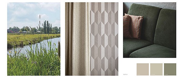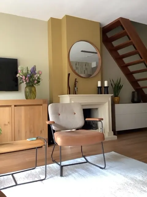 Kleuren die erg aanspraken waren groen en (oker/mosterd) geel. Behang was een belangrijk punt wat ze graag terug wilden zien op één wand. Ze houden niet van drukke botanische of effen behangen maar een wat grafisch patroon mocht het behang wel hebben, zolang het maar een rustige uitstraling heeft en past bij de rest van het interieur.