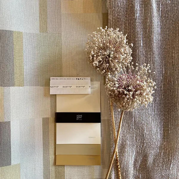 Hier heb ik een wat nonchalant vallend gordijn in een licht beige kleur uitgezocht. Met een grovere weefstructuur en een klein glimmend garen wat weer terug pakt naar het structuur van het behangpapier. Deze gecombineerd met een licht gele kleur duette.