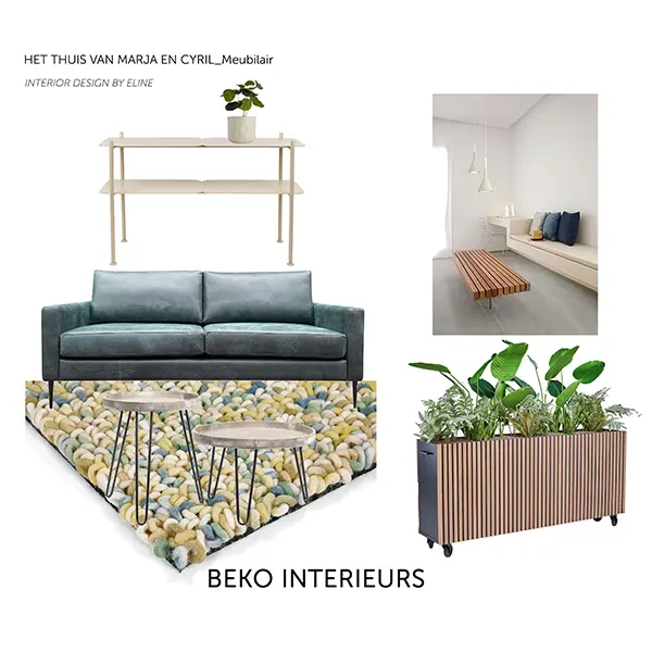Voor de inrichting ben ik uitgegaan van de bank Tess, uitgevoerd in een blauwe teddy stof. Gekozen is voor een rond karpet waarin de verschillende groen en blauw tinten in terugkomen. De bijpassende salon-, bijzettafels en side table achter de bank zijn komen uit de meubel collectie van Beko Interieurs.