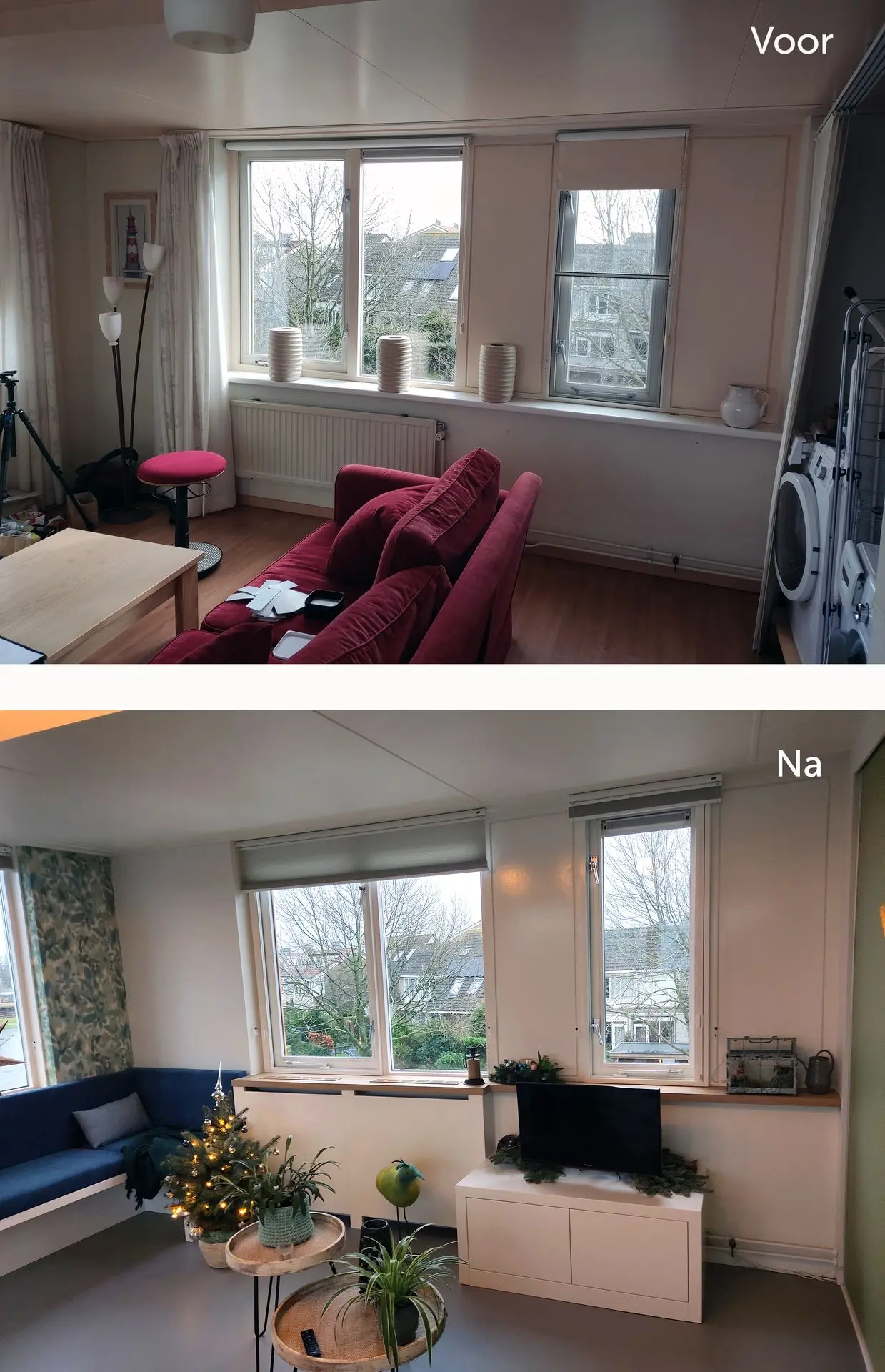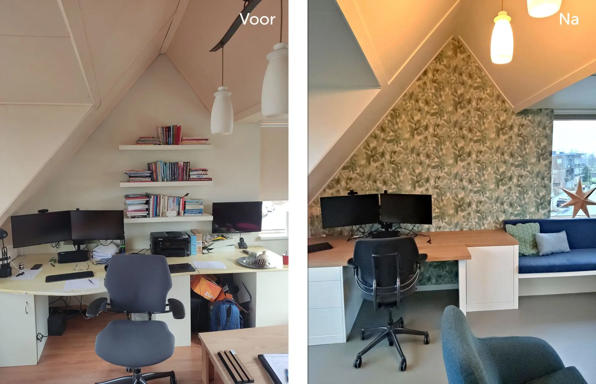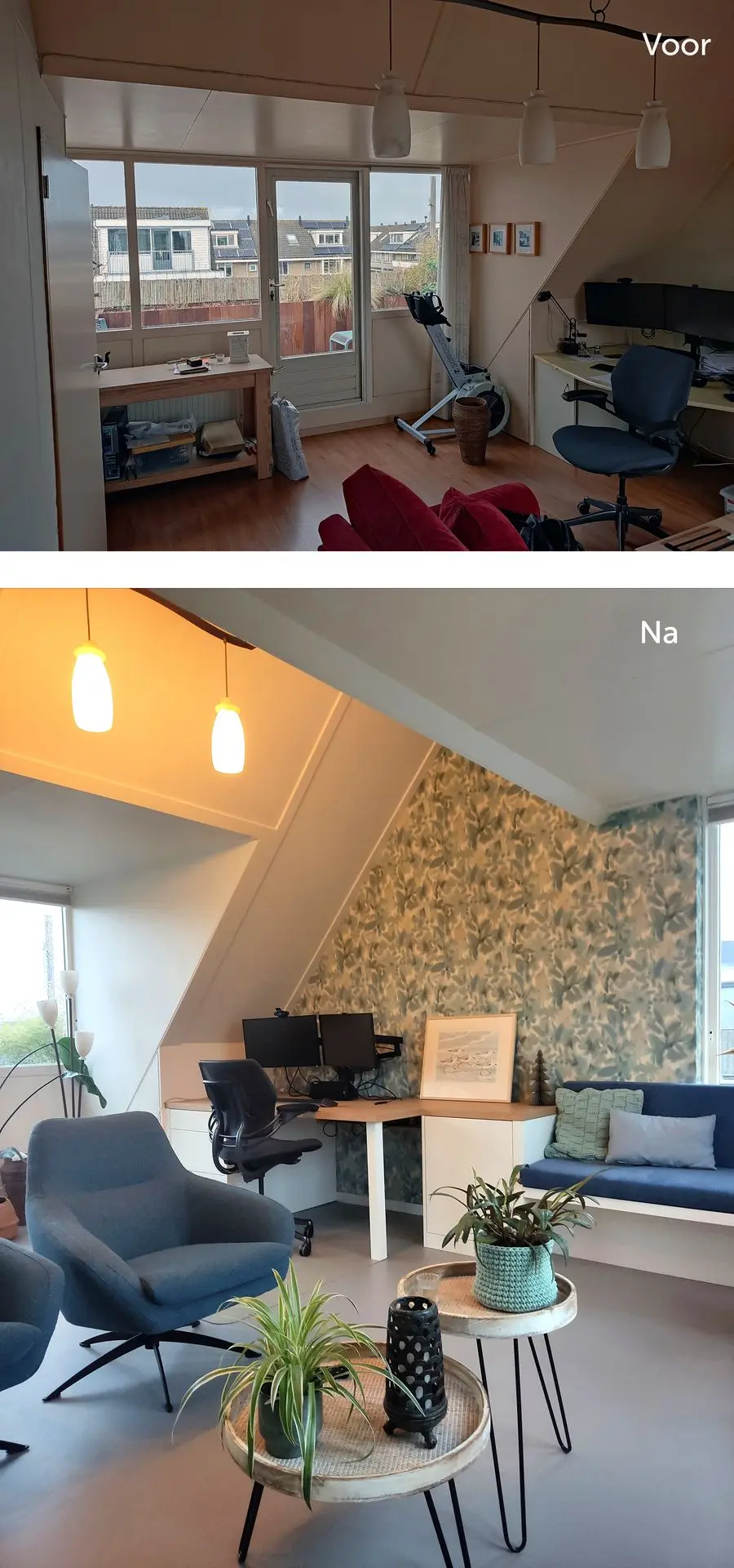Ze wilden graag advies over de indeling en kleur-, en materiaal advies. Verder moest eigenlijk alles vernieuwd worden; vloer, raamdecoratie, verf, bureau en bank.