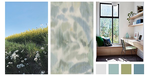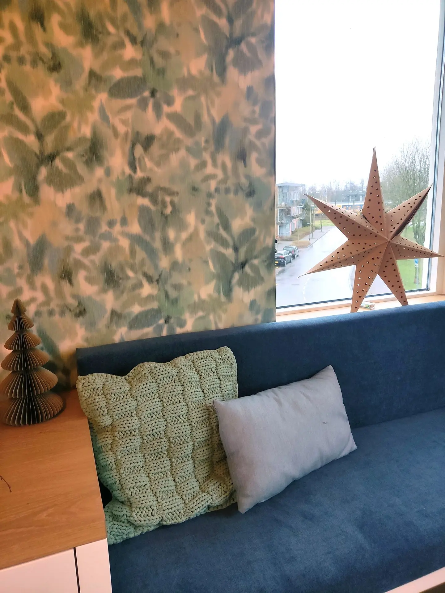 Qua behang ben ik op zoek gegaan naar iets waar bloemen in terug kwamen omdat Marja had aangegeven dat dit haar aanspreekt. Ik heb gekozen voor een Botanical Flower behang, in groene en blauwe tinten. De bloemen in dit behang zijn vrij abstract en wat vaag, alsof ze achter matglas zitten waardoor het een rustige uitstraling geeft.