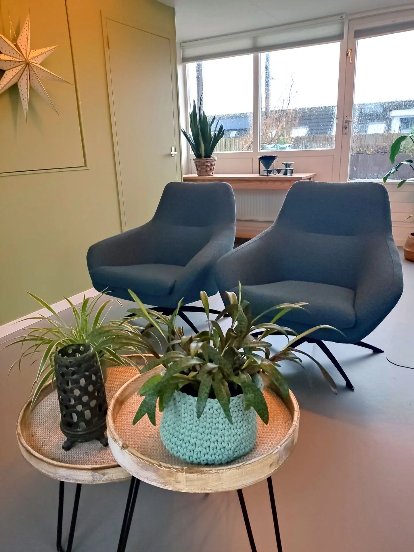 Marja gaf aan dat ze niet van grijs en beige houdt maar wel van kleur, vooral groen-, en blauwtinten spreken haar aan. Vorig jaar hebben ze hun balkon helemaal aangepakt en ze zouden het fijn vinden als de kamer hier mooi bij aansluit. Op het balkon komen blauwe accenten voor in de vorm van stoelen en kussens.