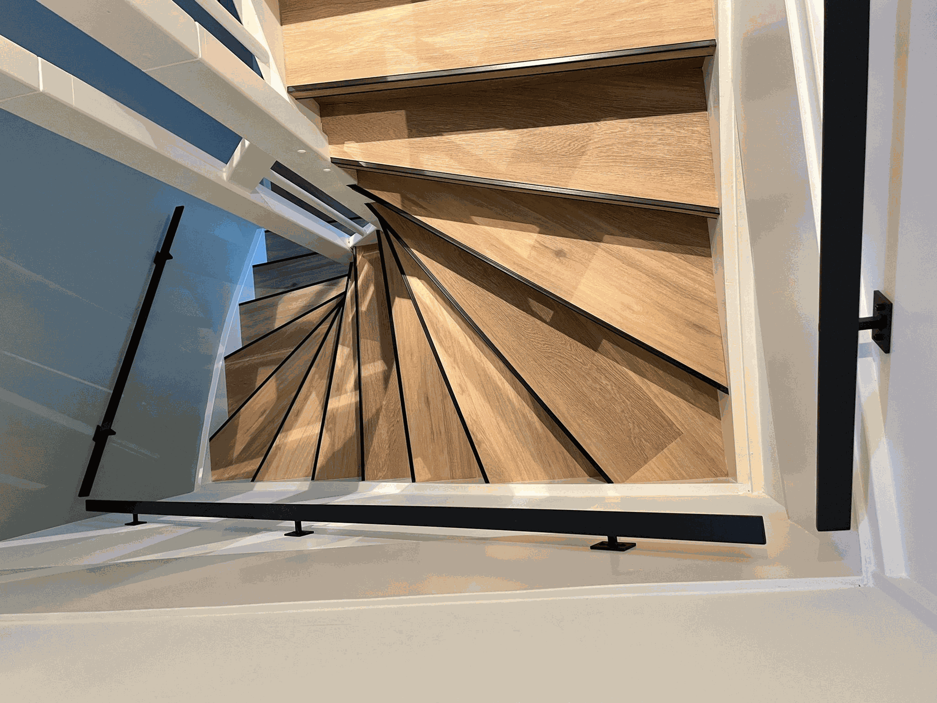 Weleens gedacht aan een traprenovatie? Dan is bekleden met PVC absoluut ook een heel mooi en ook nog eens veel voordeliger alternatief. Deze hal kreeg een ware metamorfose door de trap en de vloer met dezelfde PVC te bekleden, waardoor de rust werd behouden. De treden van de trap werden afgewerkt met een mooi subtiel zwart stripje voor het optimale behoud en om eventuele butsen en stoten te voorkomen.