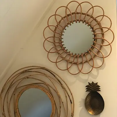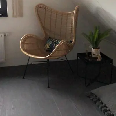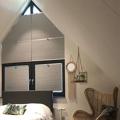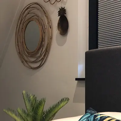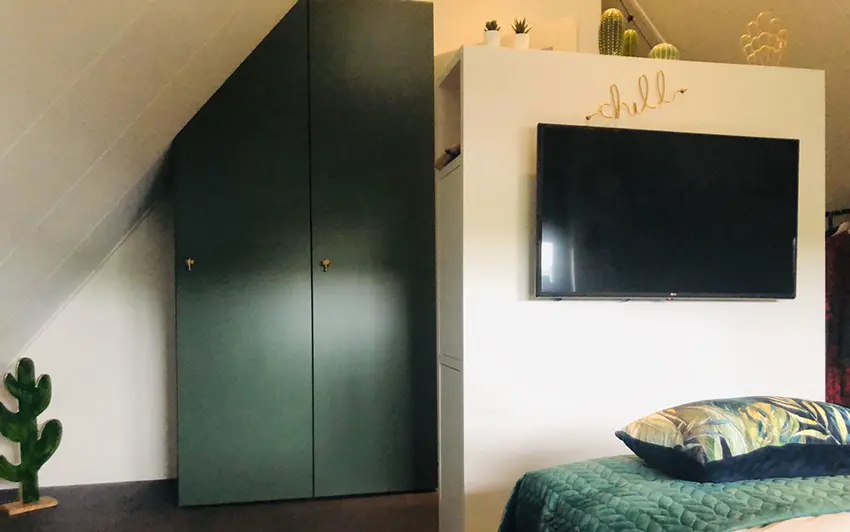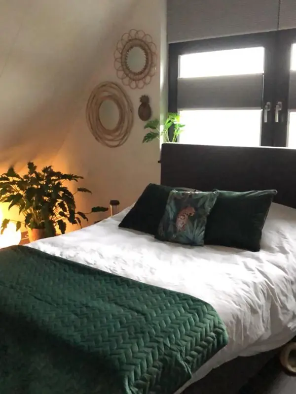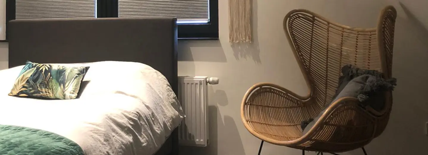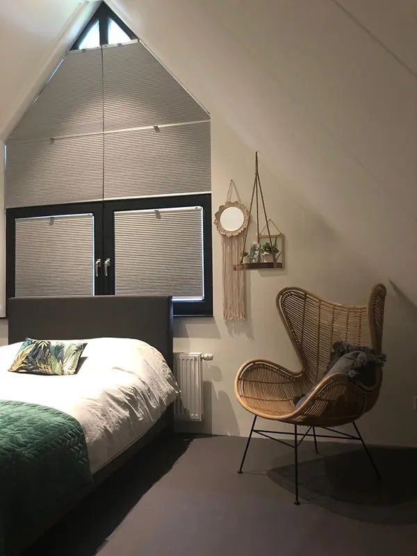 Een slaapkamer met de mogelijkheid om fijn te chillen werd er gecreëerd op deze zolderkamer. Door het toevoegen van rieten accessoires werd de kamer ondanks het stoere karakter toch zacht en vrouwelijk. Op de vloer kwam een donkere vinyl, die naast heel praktisch ook mooi oogt bij de witte HMB kleur Gips. De schuine ramen waren een uitdaging, maar werden door gebruik te maken van de dupligordijnen mooi afgedekt en kunnen naar believen ook halverwege het raam geplaatst worden, zodat het licht toch mooi naar binnen kan vallen.