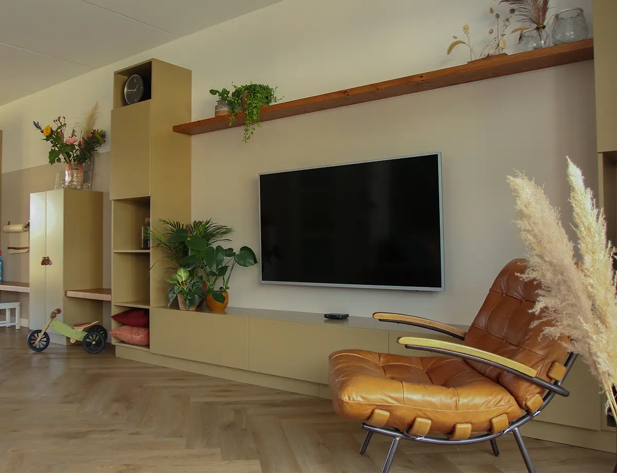 Er moest ruimte zijn om te spelen, maar ook ruimte om persoonlijke details toe te voegen. Zo kwam ook dit wandmeubel tot stand, ontworpen en gemaakt door meubelmakerij De Twijgen.