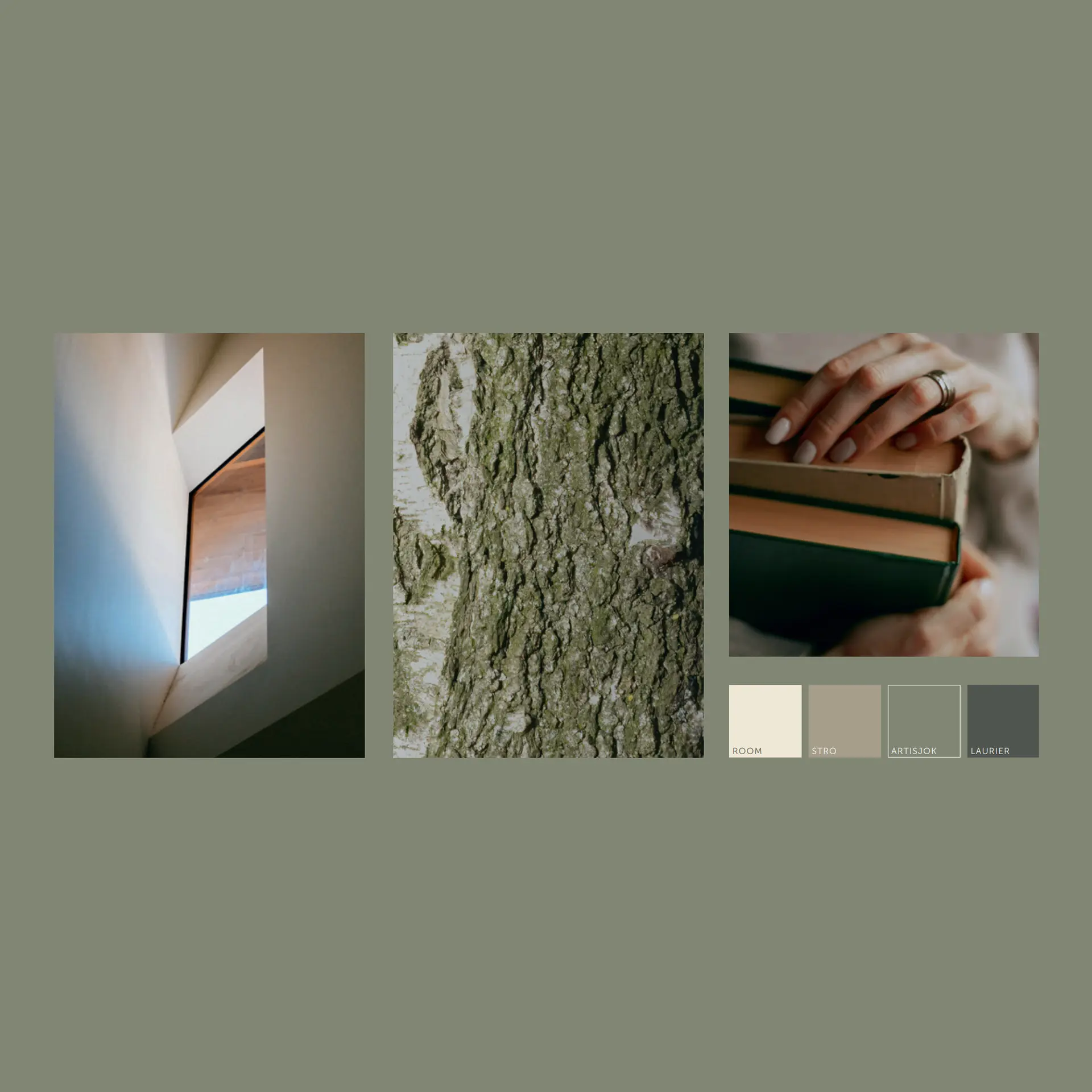 Het palet is kruidig en zacht: Room en Stro als basis; Artisjok voor warmte; Laurier voor diepte. Met linnen, geborsteld hout, wol en keramiek blijft alles natuurlijk en ingetogen