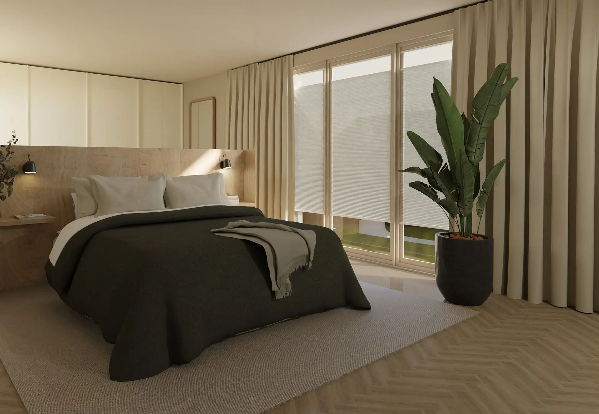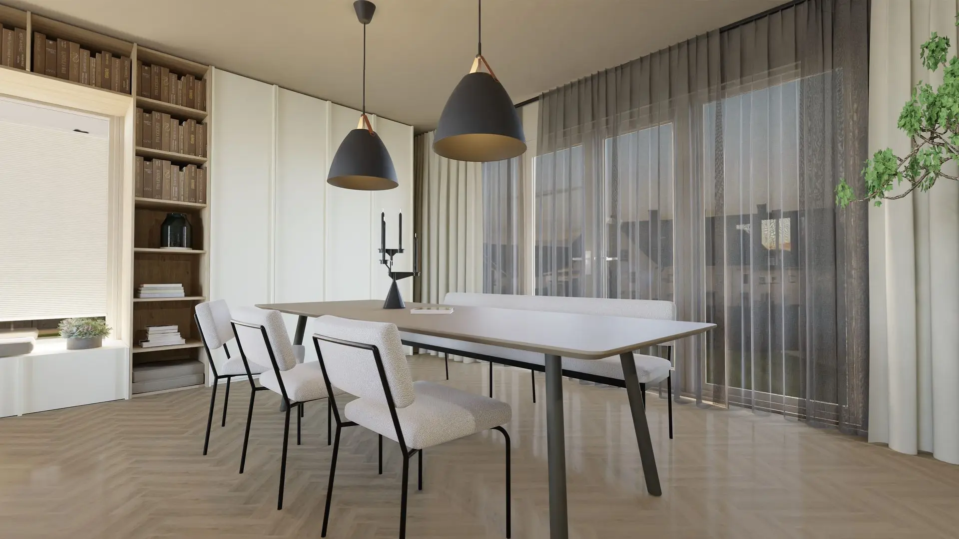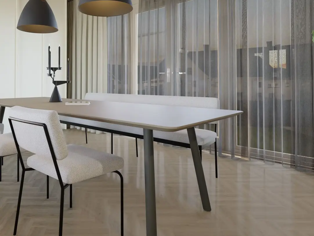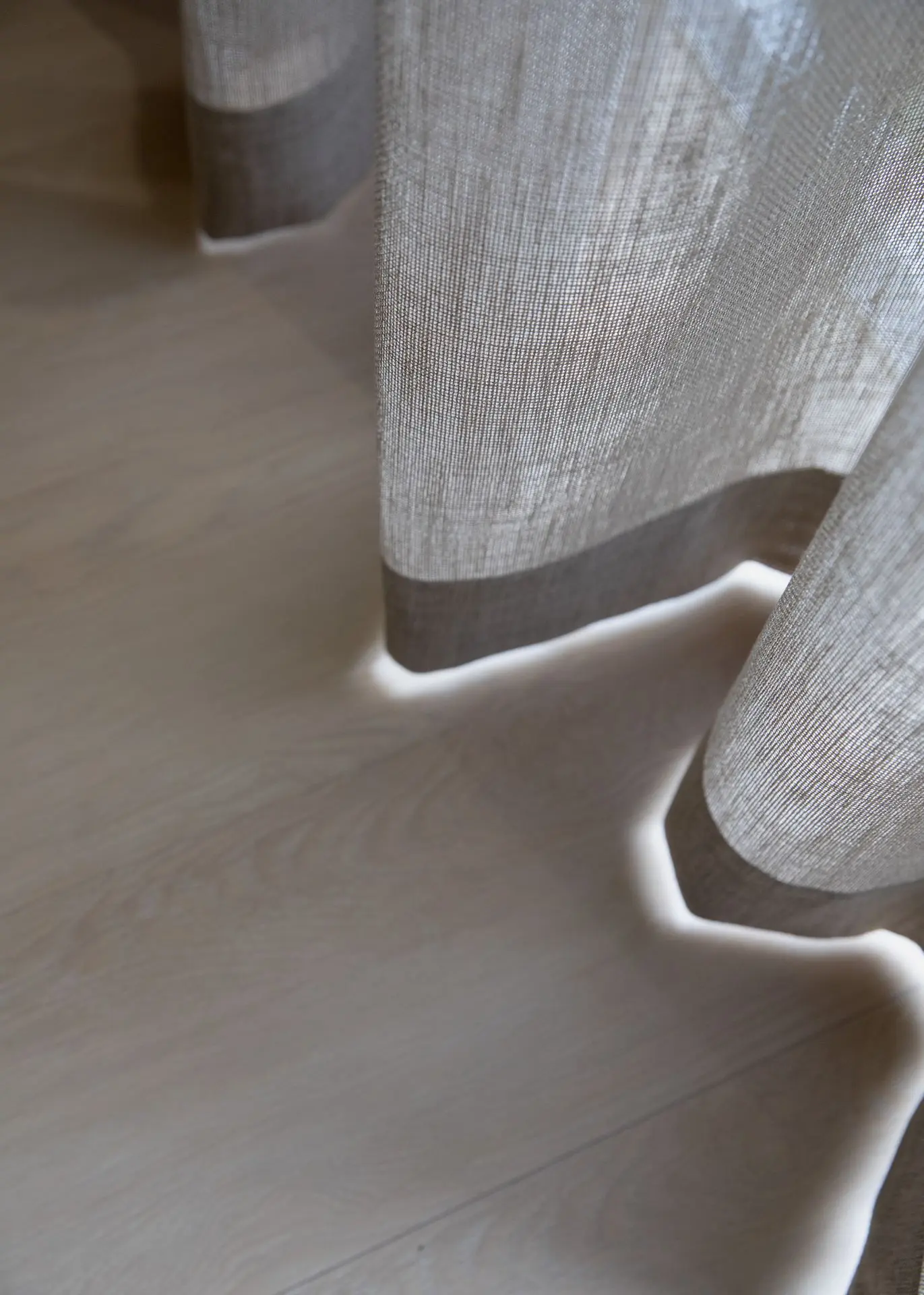 Grote raampartijen vangen het ochtendlicht dat zacht neerdaalt op geweven gordijnen en matte texturen. Overgangen zijn vloeiend: van kamer naar kamer, van dag naar avond. Je leeft mee met de seizoenen.
