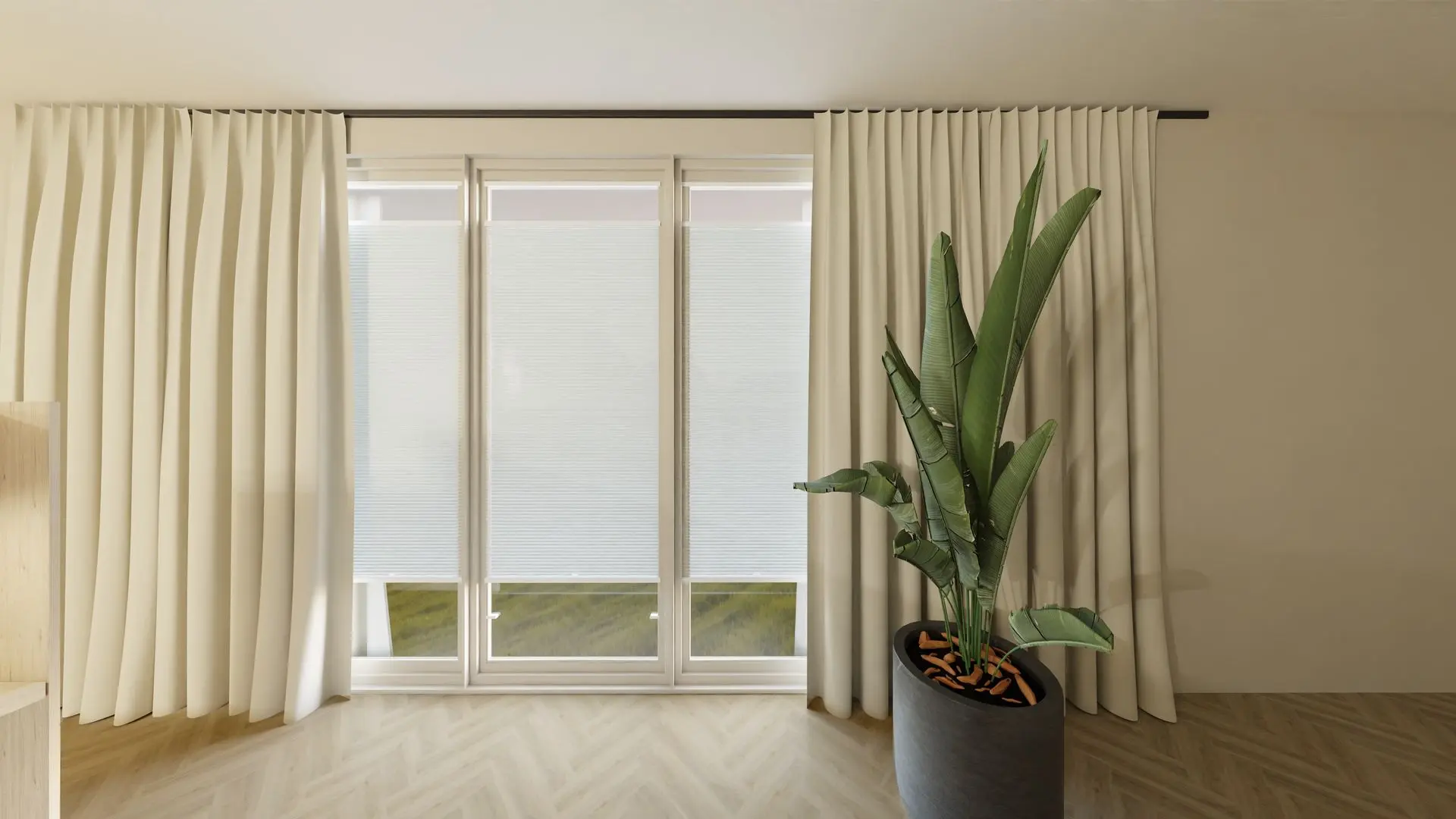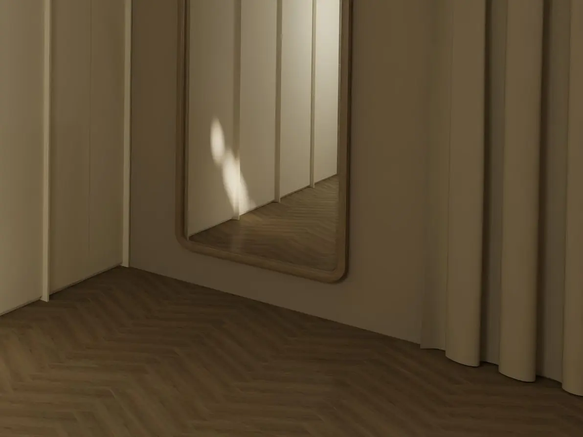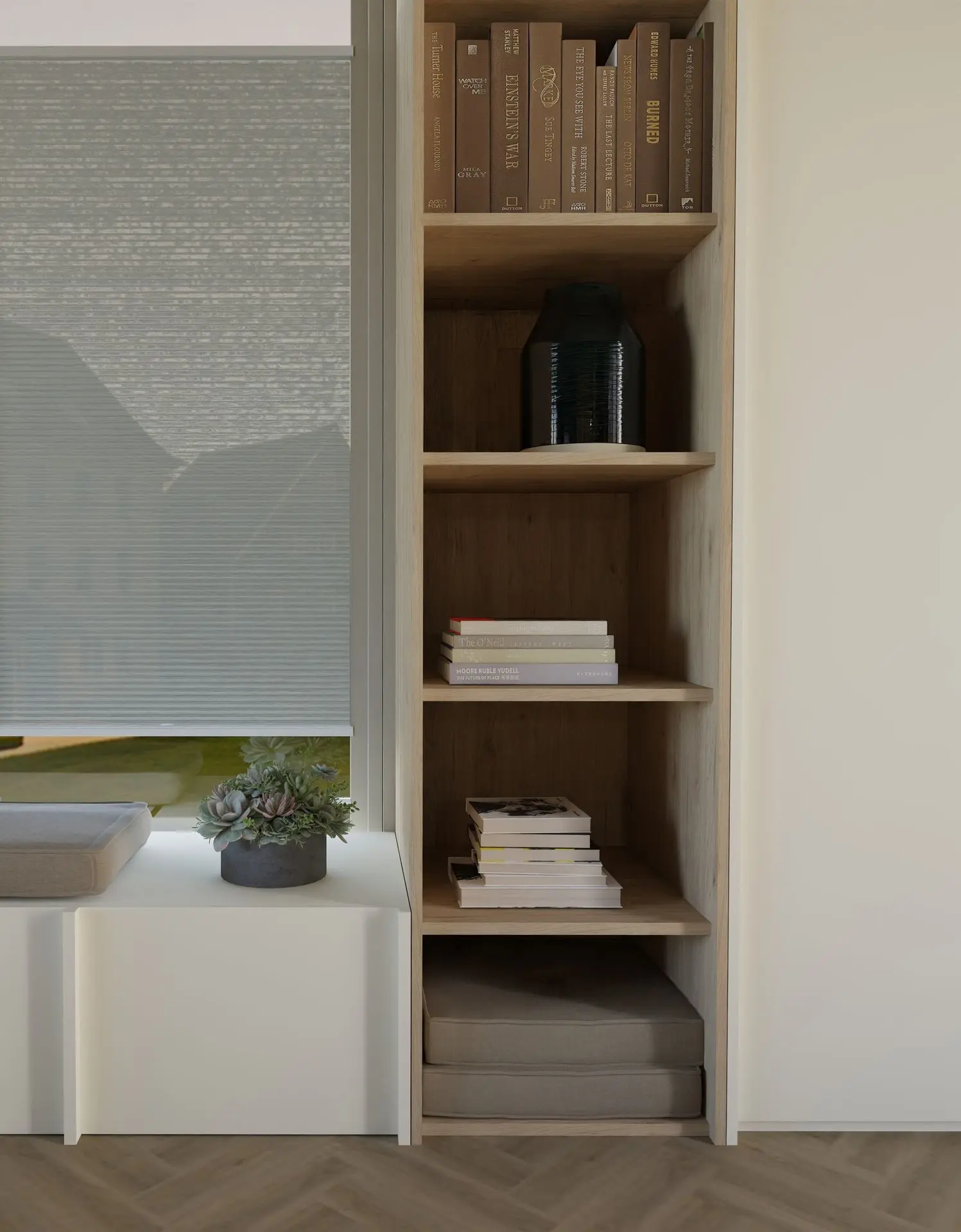 Grote raampartijen vangen het ochtendlicht dat zacht neerdaalt op geweven gordijnen en matte texturen. Overgangen zijn vloeiend: van kamer naar kamer, van dag naar avond. Je leeft mee met de seizoenen.