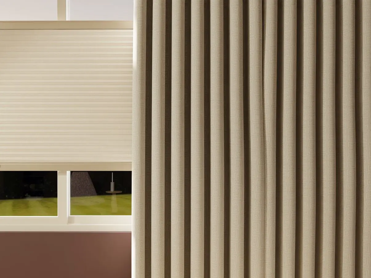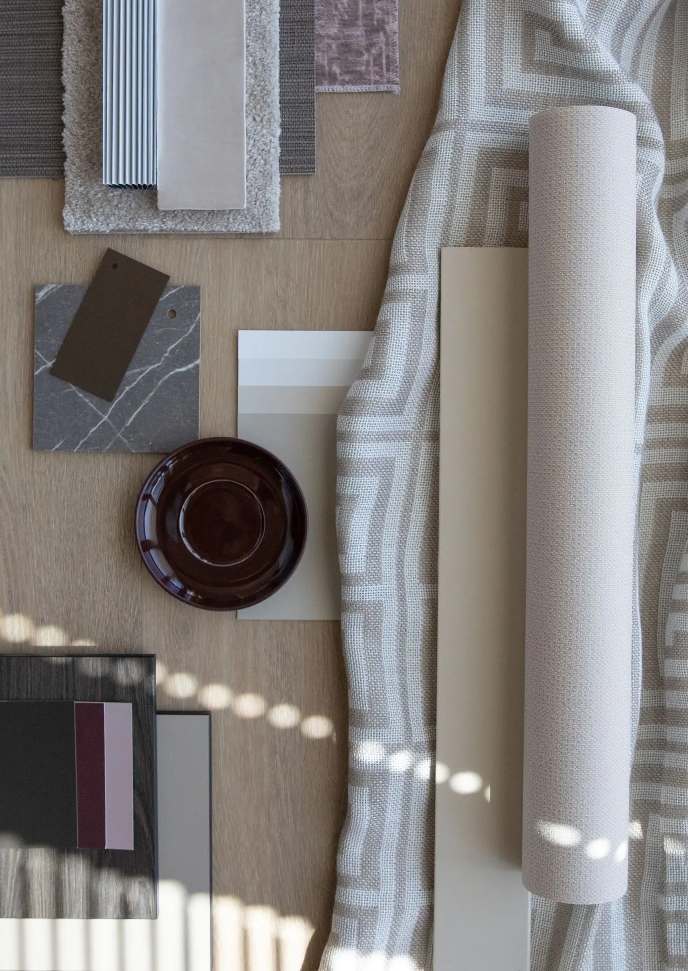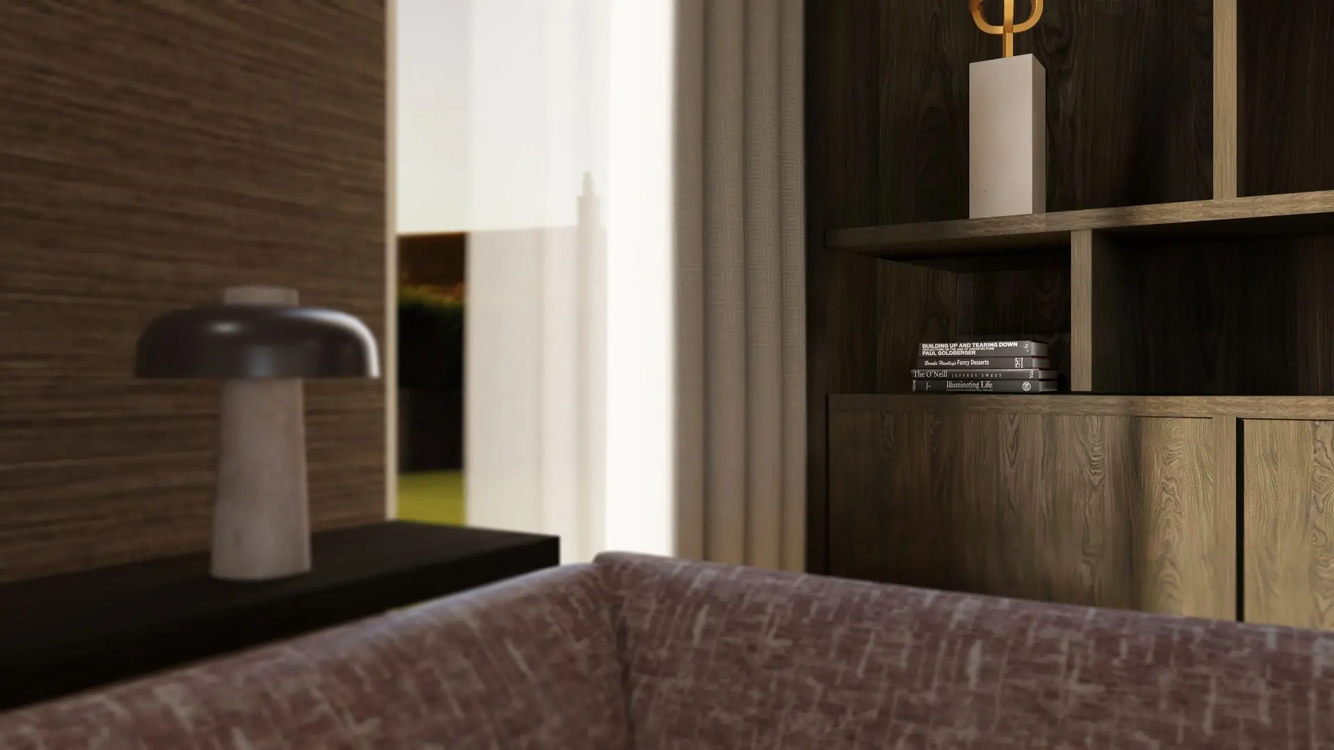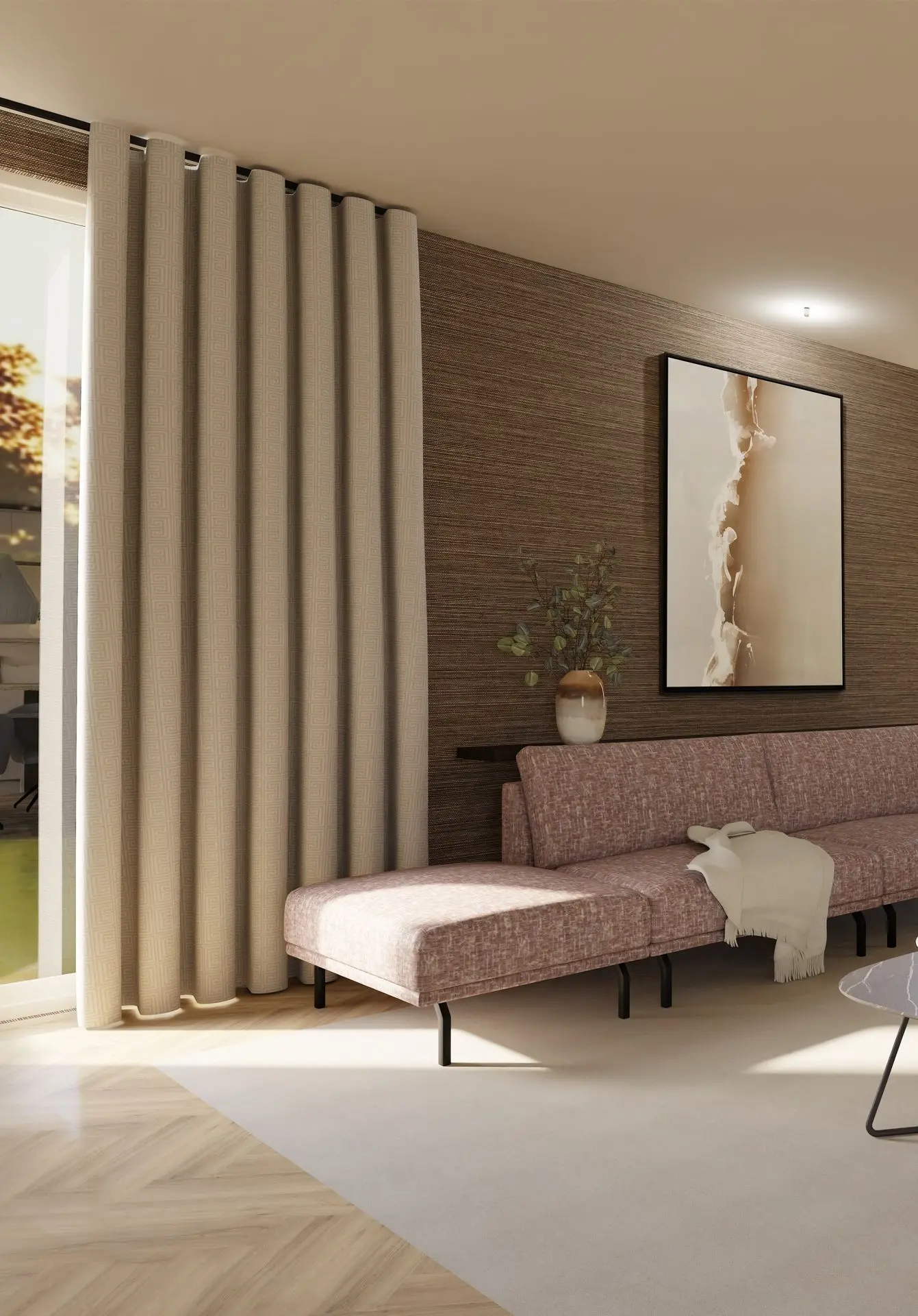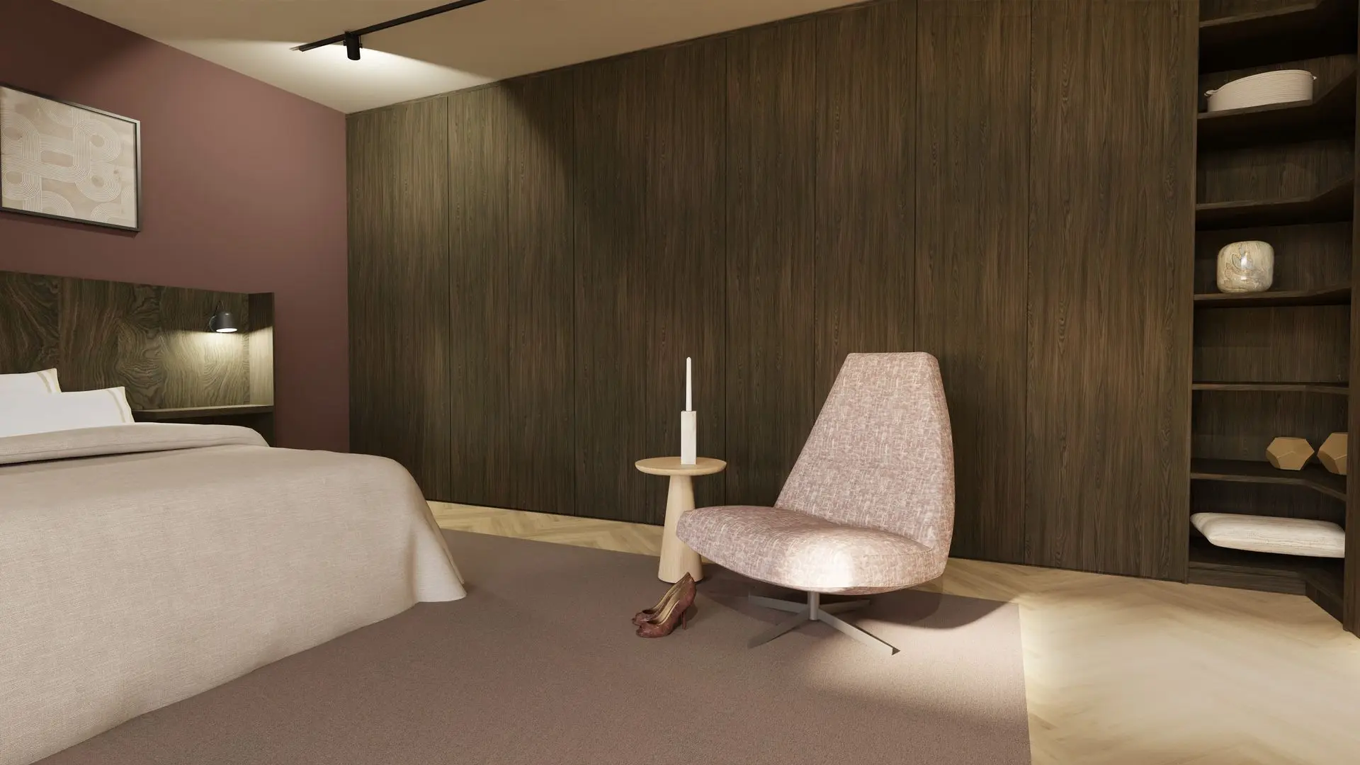 Het licht is geregisseerd: gefilterd door volle stoffen en gevangen door matte en subtiel glanzende oppervlakken. Hout, textiele wandbekleding en delicate metalen accenten maken harmonie tastbaar — evenwichtig en verfijnd