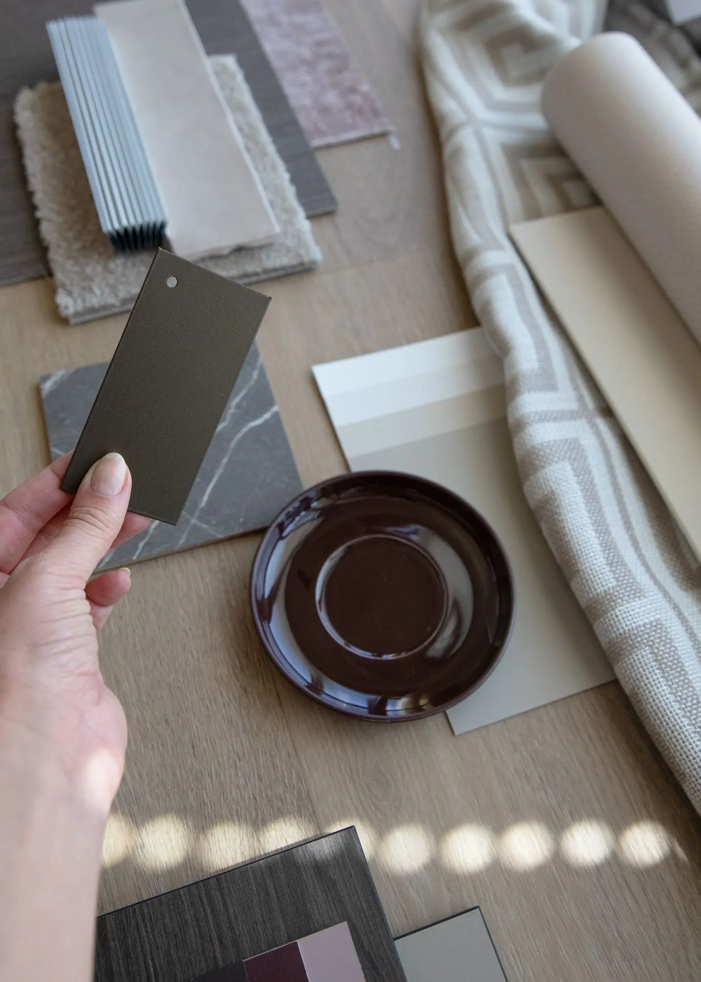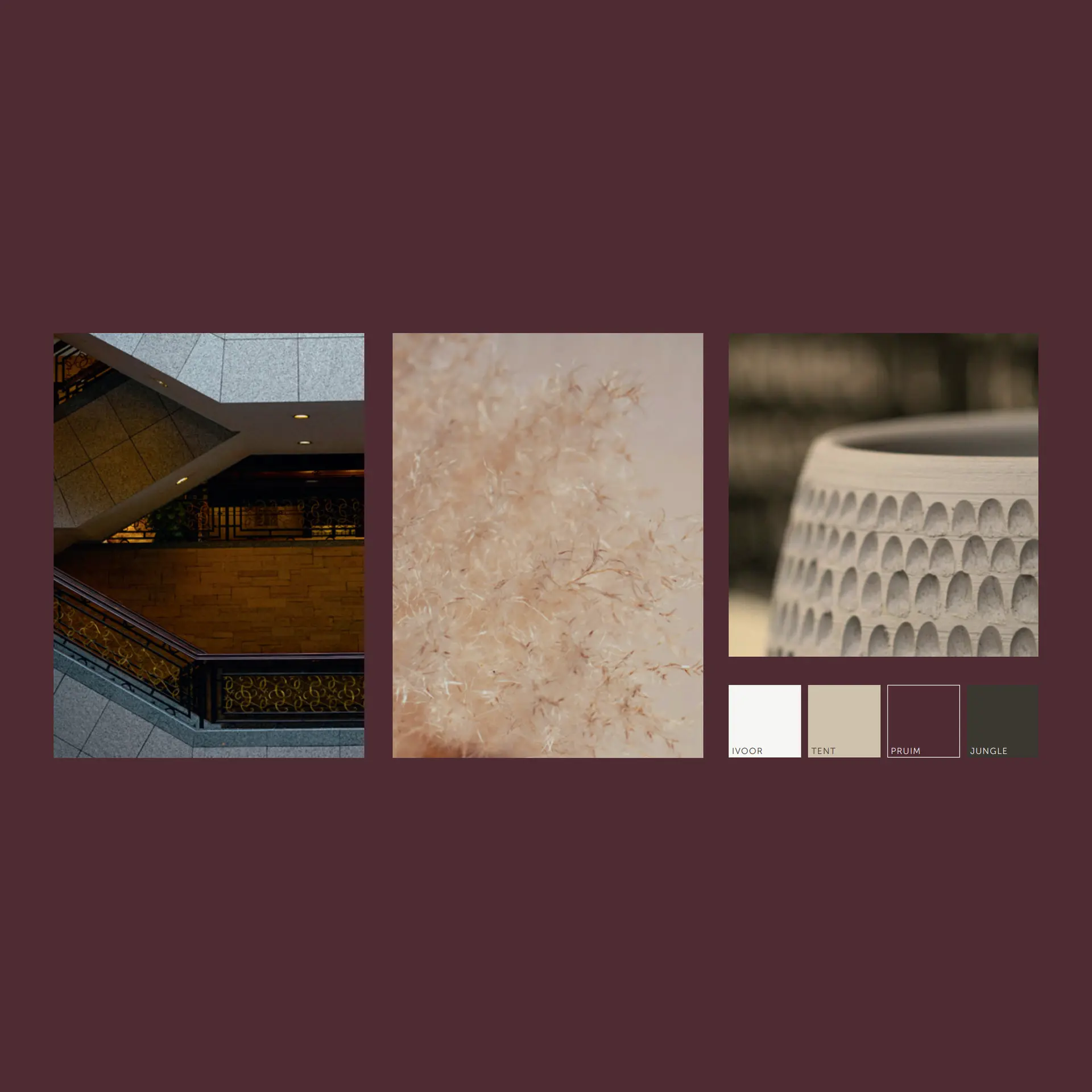 De basis is warm en licht: Ivoor en Tent. Ze worden gedragen door Pruim en Jungle, tinten die structuur en diepte brengen zonder te overheersen. Elk element staat in zorgvuldige dialoog met de rest.