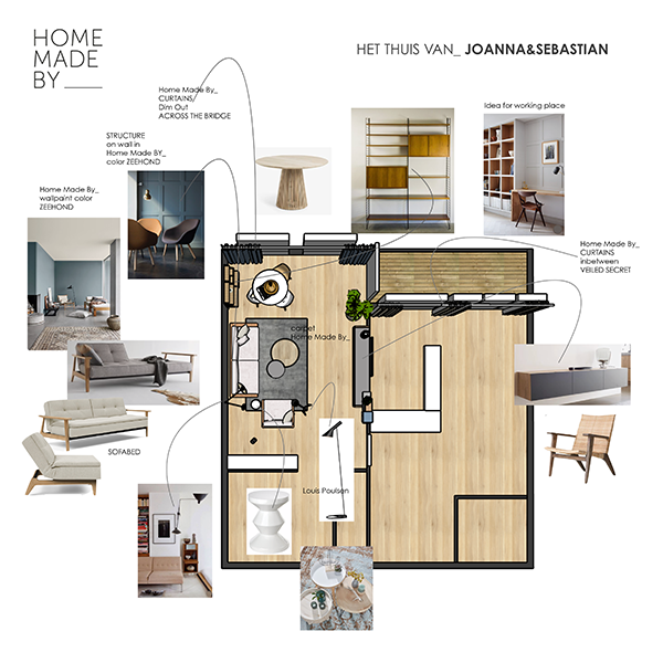 De woonkamer is een mooie overzichtelijke ruimte met weinig spullen. Joanna houdt van orde en van mooie design klassiekers en is vooral degene die zich met het interieur bezig houdt. Heel leuk om te zien dat Sebastian gaandeweg ook oog blijkt te hebben voor mooie dingen en de praktische kant meeneemt in de keuze. Zo’n samenwerking is voor mij fantastisch en houdt scherp. Joanna en Sebastian houden van een rustig interieur maar het heeft de neiging saai te worden. Vandaar dat ik voor gekleurde wanden kies die rustig en vergrijsd zijn en diepte en warmte geven. Een Scandinavische sfeer met vintage wordt het uitgangspunt. De textuur komt in de gordijnen, behang en het vloerkleed. De meubels komen in neutrale kleuren ecru, licht grijs en licht hout, maar met een bijzonder design. Oud en nieuw worden gecombineerd. Armaturen en een mooi lijnenspel in de accessoires komen in de kleur Houtskool.