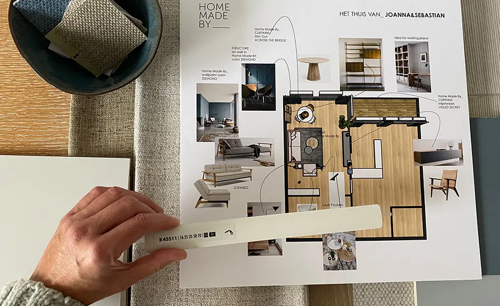 In onze designdate werd al meteen duidelijk dat Joanna&Sebastian een super gezellig jong stel zijn met een leuk fris nieuw huis op IJburg. Lekker vlak bij het Sciencepark waar Joanna werkt aan duurzame cosmetica. Ze willen een weloverwogen besluit nemen voor de inrichting van de woonkamer en hebben mij gevraagd ze hiermee te helpen. Het stel krijgt regelmatig bezoek van vrienden en familie. Een slaapbank is gezien de beperkte ruimte een vereiste. Daarnaast is films kijken, met een projectiescherm, een grote hobby. Het is duidelijk, de woonkamer moet voldoen aan meerdere functies….