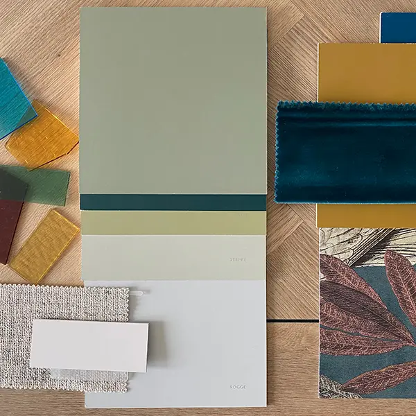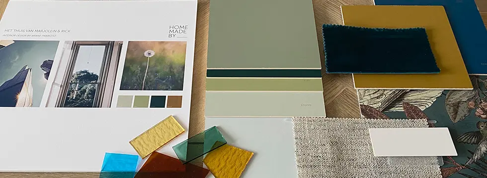 Ik begin met verbinden. De kleuren van de glas-in-lood ramen zijn een dankbaar uitgangspunt voor het kleurplan. In de woonkamer is een lambrisering in een groene kleur. De wand naast de open haard krijgt boekenplanken en samen met de wand worden ze in dezelfde groene kleur geschilderd. Voor de oude platenspeler van Rick wordt een speciale hoek gemaakt met de vintage vlinderstoel. Een rechthoekig vloerkleed onder de bank wordt speels gecombineerd met een rond kleed en verbindt de vlinderstoel met de moderne bank. In de eetkamer komt lichtgroen op de muur. Houten jaloezieën en een lichtdoorlatend gordijn met een luxe waveplooi. Voor een speels effect komen boven de grote eettafel lampen in verschillende hoogtes. De slaapkamer krijgt een intieme ‘hotelsfeer’. De wanden zijn diep blauw. De achterwand wordt doorbroken met een stijlvol exotisch behang. Daarbij passen gordijnen in velvet voor een luxe touch. Plafondlamp Vertigo is een eyecatcher. Het vloerkleed geeft warmte en comfort. Met een grote plant die rust uitstraalt is deze slaapkamer de plek om volop te genieten.