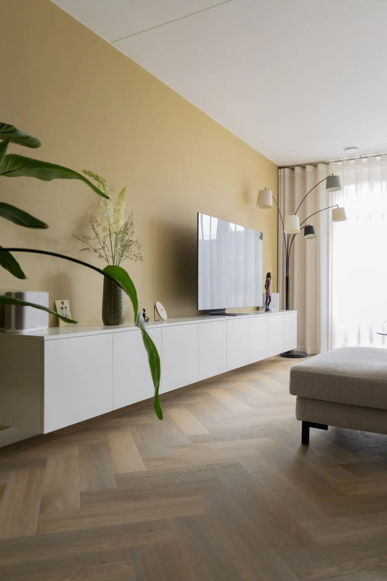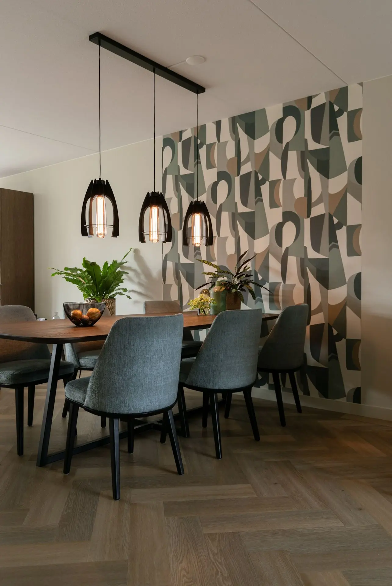 Een frisse en gezellige woonkamer en keuken, waarin de kleur van de stoelen belangrijk waren om dit passend te maken in het ontwerp en een mooie bijpassende kleur aan toe te voegen.
