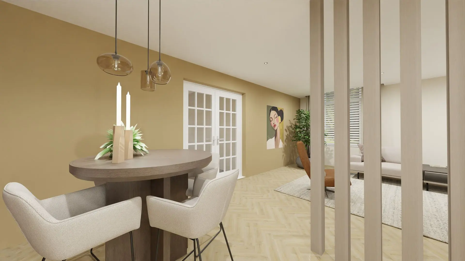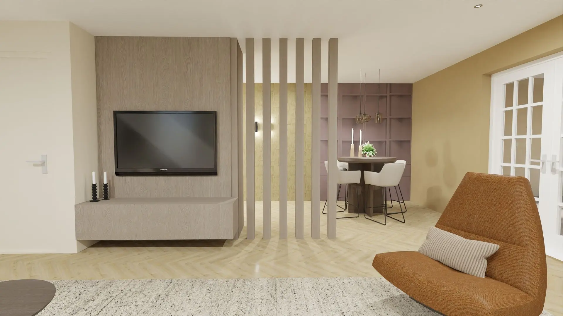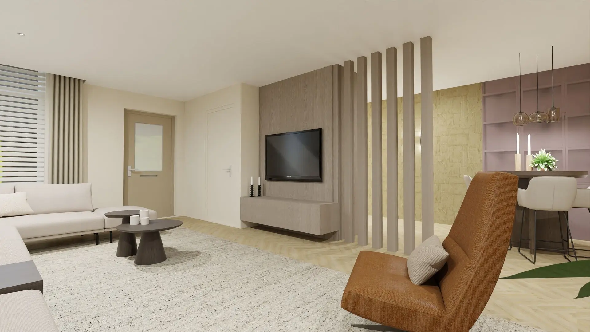 De woonkamer is een vierkantige ruimte. Ze hadden moeite deze fijn in te delen. Door een divider aan te brengen, is de kamer prettiger en ontstaat er ruimte voor meer functies. Zoals een fijne thuiswerkplek.