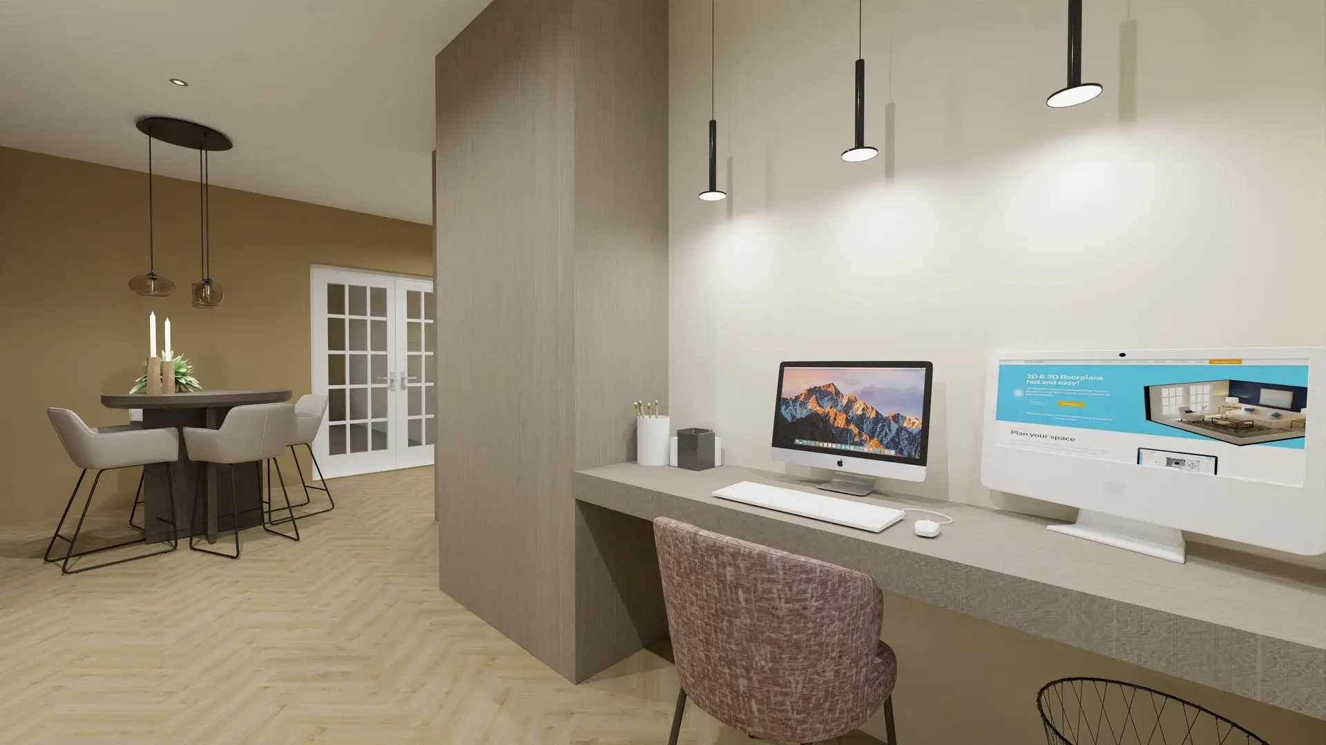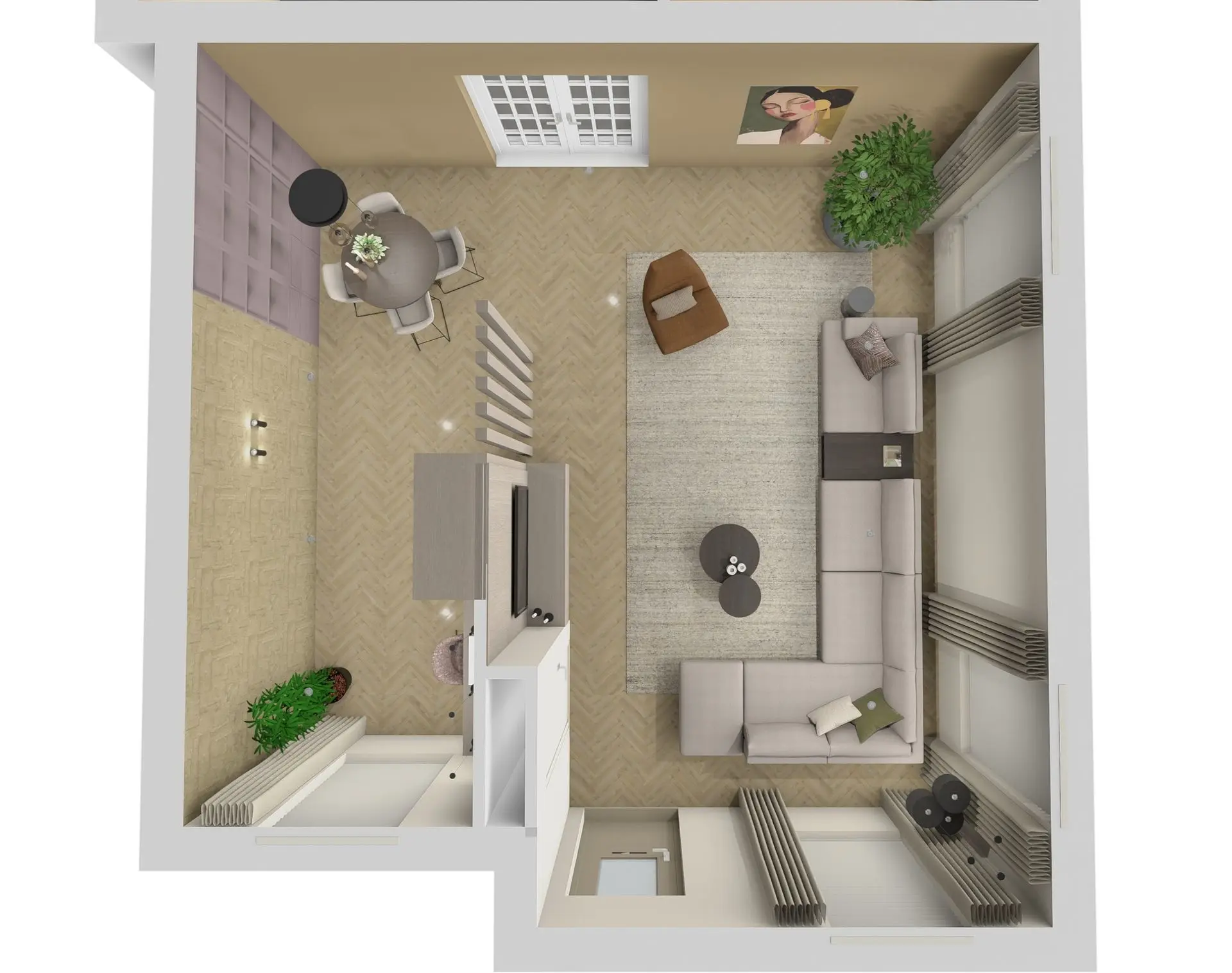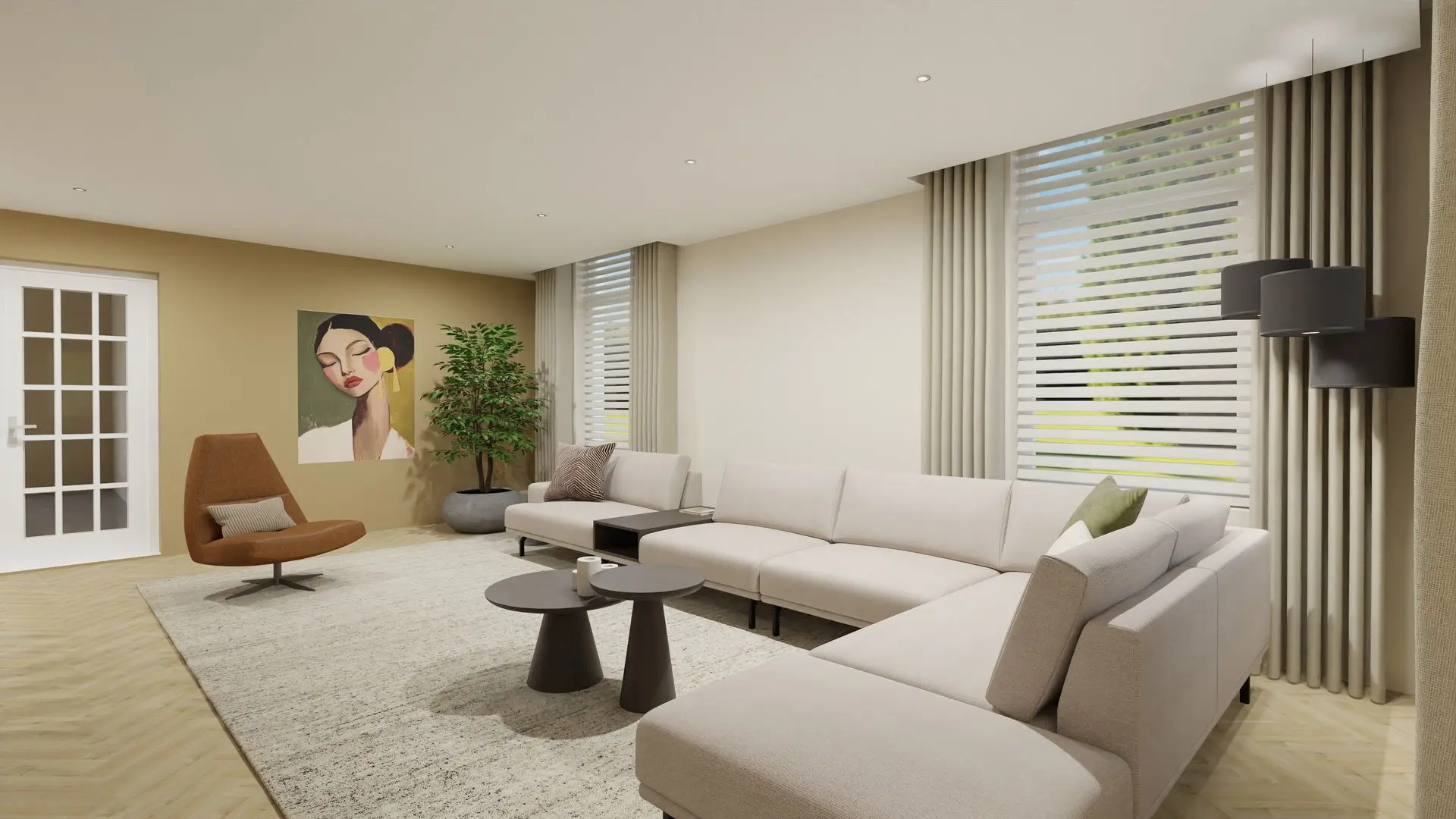 De woonkamer is een vierkantige ruimte. Ze hadden moeite deze fijn in te delen. Door een divider aan te brengen, is de kamer prettiger en ontstaat er ruimte voor meer functies. Zoals een fijne thuiswerkplek.
