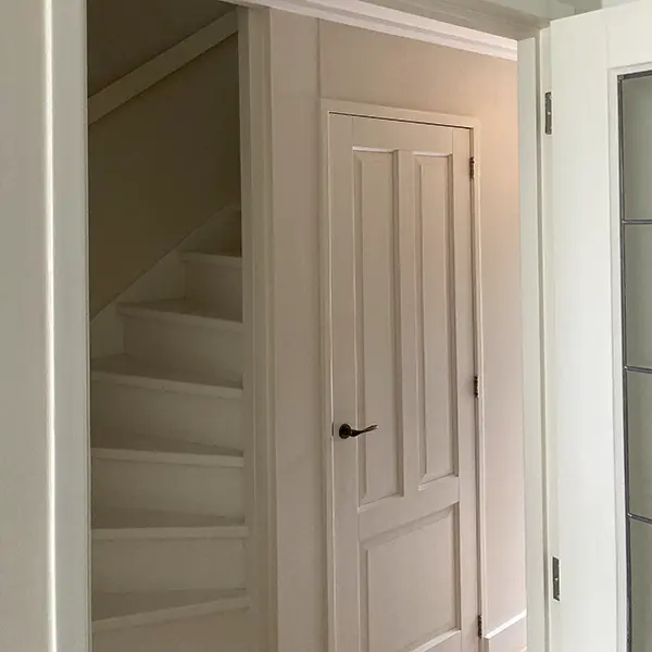 De klassieke lijnen van de bestaande schouw worden strakker van vorm zodat deze meer eigentijds is. Voor de pui met de openslaande deuren komen gevel brede vitrage gordijnen, het zicht op de tuin blijft behouden.