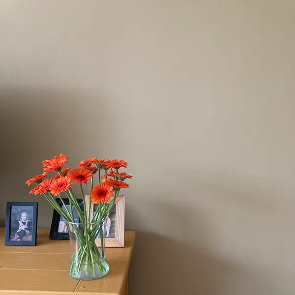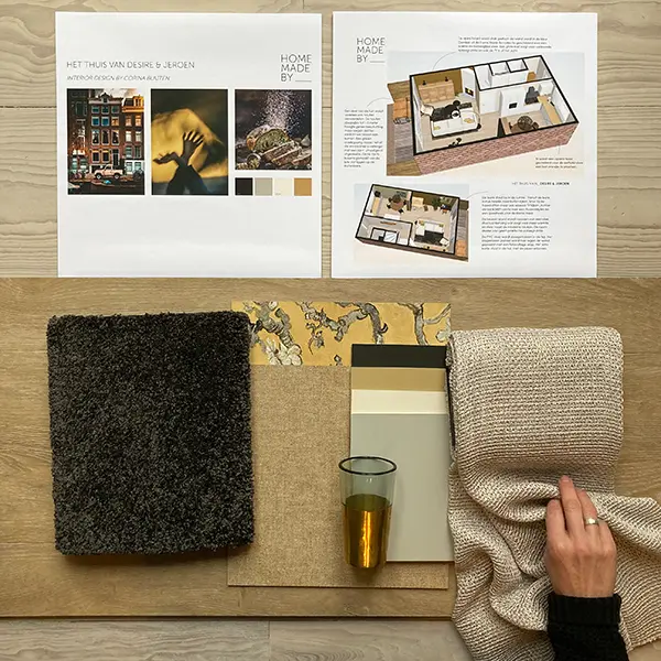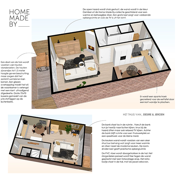 De wand bij de keuken wordt behangen met een mooi structuur behang in een oker tint. Naast de ronde eettafel wordt een haaks wandje geplaatst met een open vakkenkast er tegen aan. De achterkant van het wandje wordt met schoolbordkrijt zwart geschilderd; de speelhoek naast het bord nodigt uit om te kleuren en te spelen. Twee wanden in de woonkamer worden in de kleur Gember geschilderd en in de hoek bij het raam naast de openslaande deuren wordt een thuiswerkplek gecreëerd met een oud vintage bureautje. De woonkamer is modern, comfortabel, warm van kleur en door de vintage meubeltjes helemaal eigen van Desiré & Jeroen.