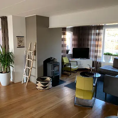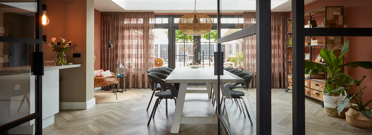 "We hebben aangegeven dat we meer kleur in ons interieur wilden. Hiervoor was alles grijs/wit. We wilden warmte creëren. We wilden ook graag stalen deuren in de kamer hebben, maar dachten zelf dat dit niet mogelijk was."