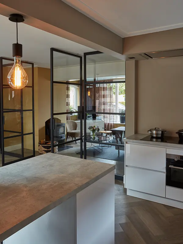 "Als we met het gezin ’s avonds op de bank bij de brandende houtkachel zitten en door de stalen deuren naar de achterkamer kijken, dan genieten wij enorm van onze woonkamer."