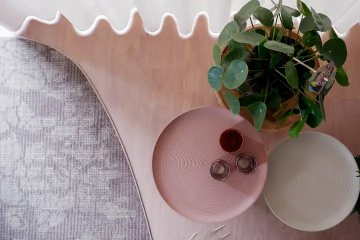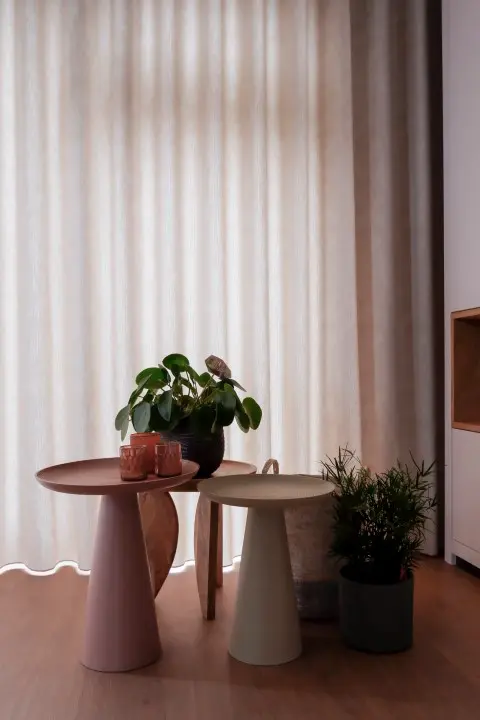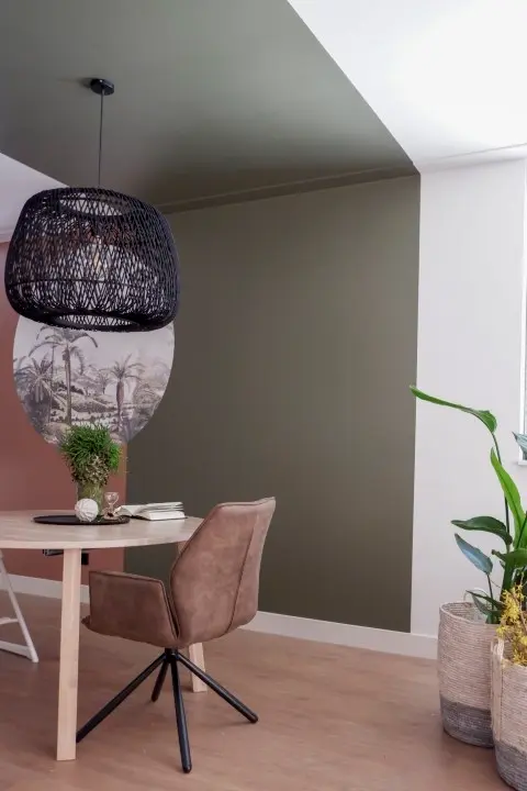 Het Design Plan 3D zorgde ervoor dat alle plannen en overwegingen tot leven kwamen. De warme PVC vloer met een kleine noest gaat op in het geheel. De inbetween gordijnen met reliëf zijn geconfectioneerd in een waveplooi. Ze hangen aan een zwarte rails om de industriële ‘touch’ van Robbert te accentueren. De eethoek is niet heel groot, staat een beetje verloren tussen keuken en zithoek. Maar door het geschilderde groene Moeras vlak op de wand en doorlopend op het plafond kreeg de eethoek zijn eigen plek in de ruimte. Het kleurvlak en de optische truc met de behang cirkel is precies het unieke effect wat Robbert en Anna zochten. De rest van de tinten zijn rustig en naturel. In de keuken geeft de kleur Panama het extra zetje om de witte keuken te verrijken. De tv mocht geen plek krijgen in de ruimte en dus is er gekozen voor een elegante sfeervolle maatwerkkast die zorgt voor eenheid en opbergmogelijkheden. De tafel, bank, stoelen, organisch gevormde vloerkleed, ronde bijzettafels, vrolijke accessoires alles past bij elkaar en is door de Interior Designer uitgekozen en afgestyled.