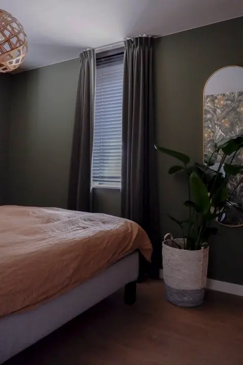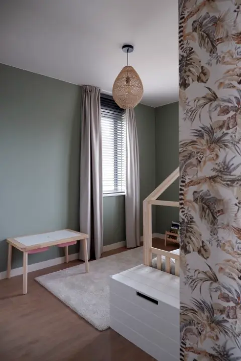 De basiskleuren komen op de bovenverdieping weer terug. De houten jaloezieën, kleur houtwerk en PVC vloer zijn dezelfde als beneden zodat er eenheid blijft. Elke kamer een unieke stijl. Zo wilden Anna en Robbert jungle in combinatie met hotel chique. Door het plafond ook donkerder te maken dan normaal krijgt de groene Moeras kleur nog meer diepte. De donker groene velours gordijnen geven een chique uitstraling. Het behang met glans en rijkelijke florale print brengt alle kleuren samen. De twee meiden kregen allebei een mooie kleur op de muur en een prachtig behang in passende tinten. Een mooie witte kast en glans/glitter gordijnen maken het helemaal af. Zelfs het washok heeft een prachtig behang die de ondergeschikte wasruimte sfeervol maakt.
