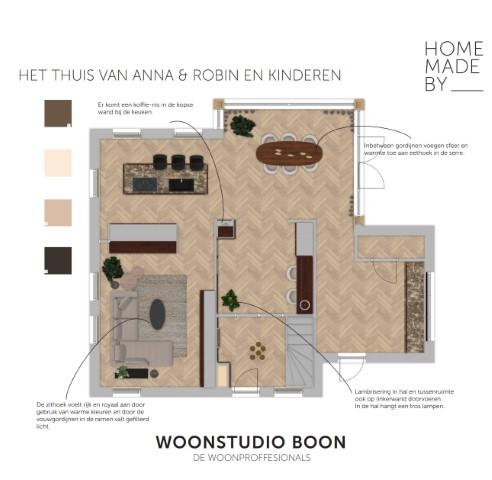 Een jong, groeiend gezin met een liefde voor stijl en comfort. Ondanks hun voorliefde voor luxe materialen en rijke afwerkingen, moet het huis vooral functioneel zijn voor het leven met jonge kinderen. Ze houden van rust, overzicht en kwaliteit – een plek die voelt als thuiskomen, maar wel met een verfijnde uitstraling. Robin neemt de technische uitvoering volledig op zich; Anna stort zich op de sfeer en uitstraling.