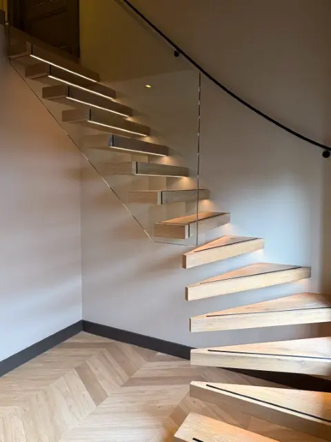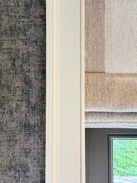 De stijl is modern hotel-chique: rijke materialen, warme houttonen en zachte kleuren, gecombineerd met strakke belijning en luxe texturen. Robin maakte zelf de maatwerkmeubels in notenhout, wat een persoonlijke en ambachtelijke touch toevoegt aan het geheel. Gordijnen en vouwgordijnen filteren het daglicht op subtiele wijze, waardoor de ruimtes zacht worden aangekleed. In de woonkamer en keuken loopt alles visueel in elkaar over door herhaling van materialen en kleur. Behang voegt extra textuur en sfeer toe. Ook op de eerste verdieping zijn kleuren en materialen consequent doorgezet, wat zorgt voor rust en eenheid.