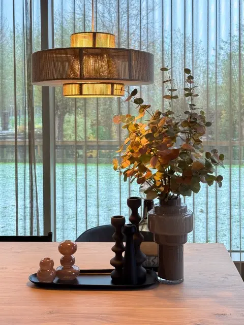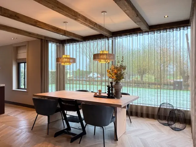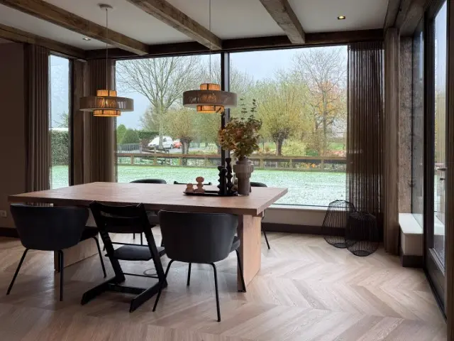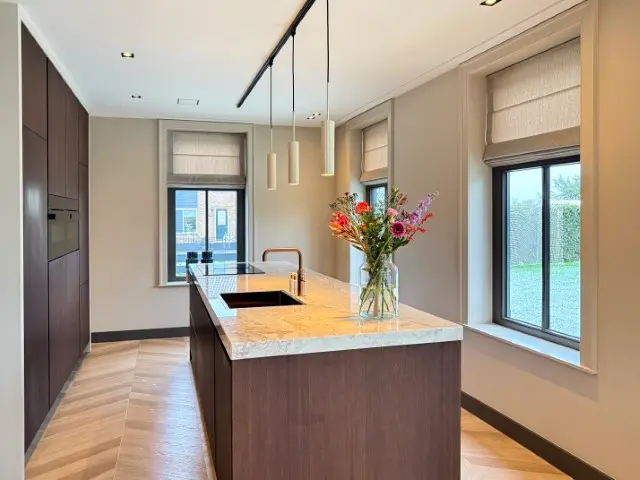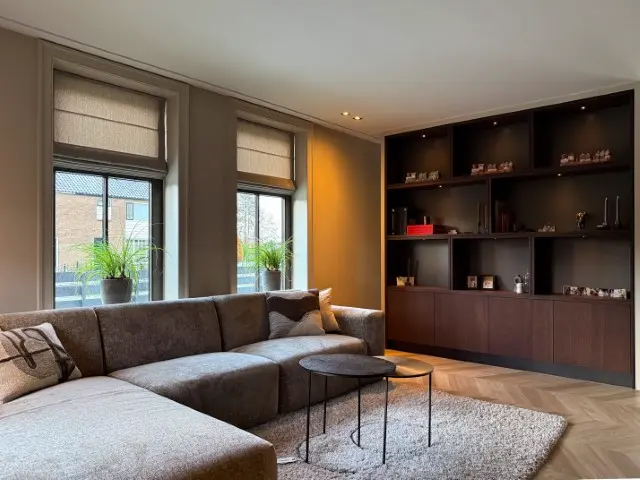 Vanaf de tekentafel tot aan de oplevering stond het creëren van een luxe, maar leefbare woning centraal. Het 3D ontwerp gaf de klant al vroeg een realistisch beeld van hun huis, wat hielp bij het maken van keuzes met vertrouwen. Door rijke materialen als notenhout, zachte gordijnstoffen en warme kleuren te combineren, is een interieur ontstaan dat uitnodigt tot samenzijn, maar ook rust uitstraalt. De ruimtes zijn met elkaar verbonden door herhaling in kleuren en structuren, zonder in te leveren op functionaliteit voor het drukke gezinsleven.