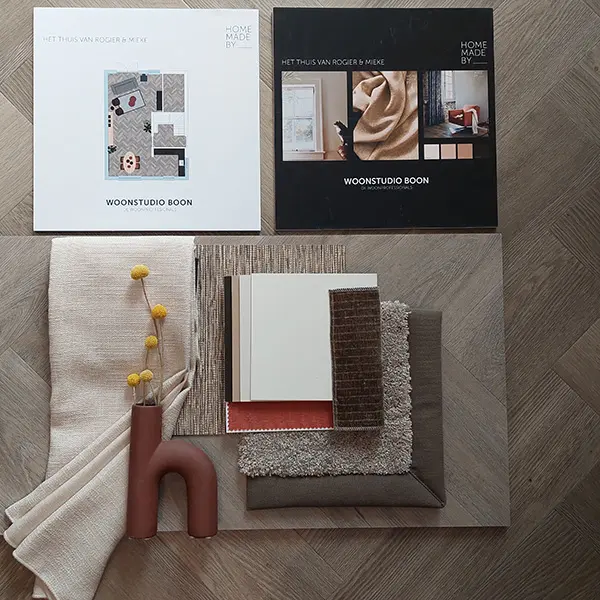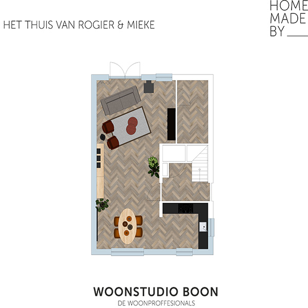 Mieke en Rogier hebben een woning aan de oude dorpsweg met een heerlijke tuin. Ze hebben een aantal moderne, strakke meubels die ze graag willen behouden maar missen daardoor wel de warmte in het huis. Door de strak gestucte, lichte wanden en donkere vloer mist de eenheid in de woning. Bovendien hebben ze in de gehele woonkamer veel accessoires waar herinneringen aan verbonden zijn en missen daardoor de rust die ze graag willen vinden als ze thuis heerlijk voor hun hout gestookte kachel zitten. Mieke en Rogier vinden het fijn geheel ontzorgd te worden van ontwerp tot en met uitvoering.