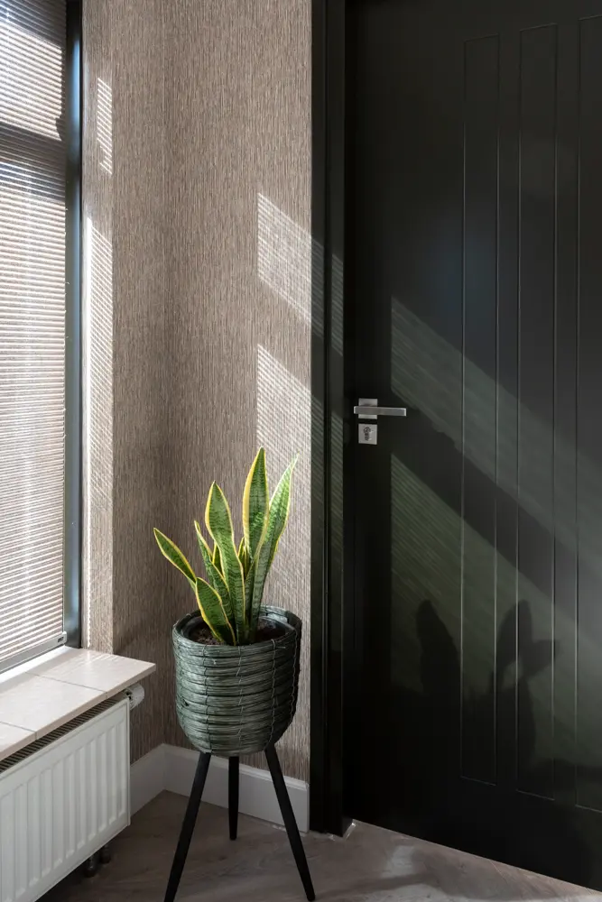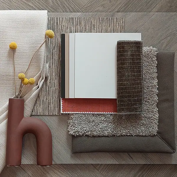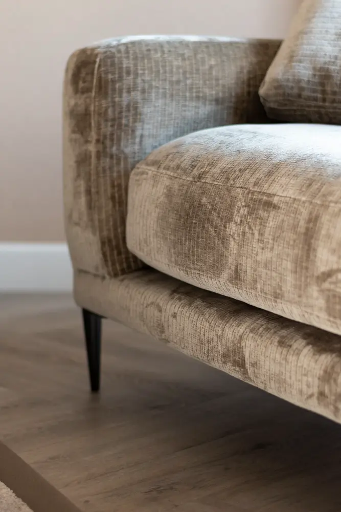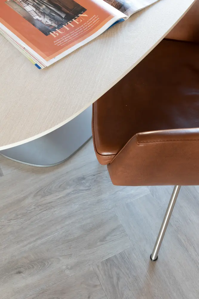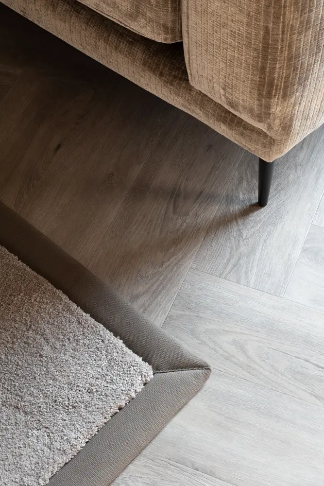 Een 2D ontwerp helpt Mieke en Rogier te zien dat het omdraaien van de fauteuils met de grote tv een mooie, sfeervolle zithoek vormt rondom de kachel. Het toevoegen van een nieuwe bank in veloursstof op een zacht karpet creëert warmte en intimiteit. De stof van het inbetween gordijn geeft de zithoek nog meer sfeer maar het uitzicht op de prachtige tuin gaat niet verloren. Door de wand achter de tv te behangen in een iets donkerdere tint, valt de grote tv weg op de wand. Door hun kasten direct naast elkaar te plaatsen en daarbij alle accessoires te clusteren ontstaat de rust die zij zochten. Aardse tinten op de wanden en in de pvc visgraat vormen een mooie mix met de bestaande strakke meubels. Leuk detail zijn de jeugdfoto’s gedrukt op canvas en verwerkt in een Dock Four. Daarmee maakten we het ontwerp en dus ook hun woning, persoonlijk en eigen.